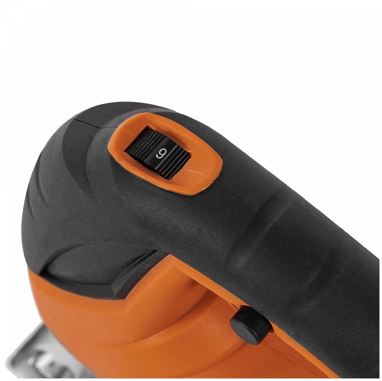 Удобная ручка, в руке сидит идеально и не выскальзывает из рук. Сетевой шнур длинный. Ход пилки от 500 до 3000. Шестигранный ключ можно прикрепить на шнур в специальный пластиковый отсек для этого, чтобы не потерять. Подошва качественная, из стали. Маятниковый ход регулируется. Плавная регулировка оборотов. Дизайн яркий, заметный среди других инструментов. Режет ровно, срез ровный. В работе понравился как себя ведет. Поэтому недостатков и минусов не нашел.