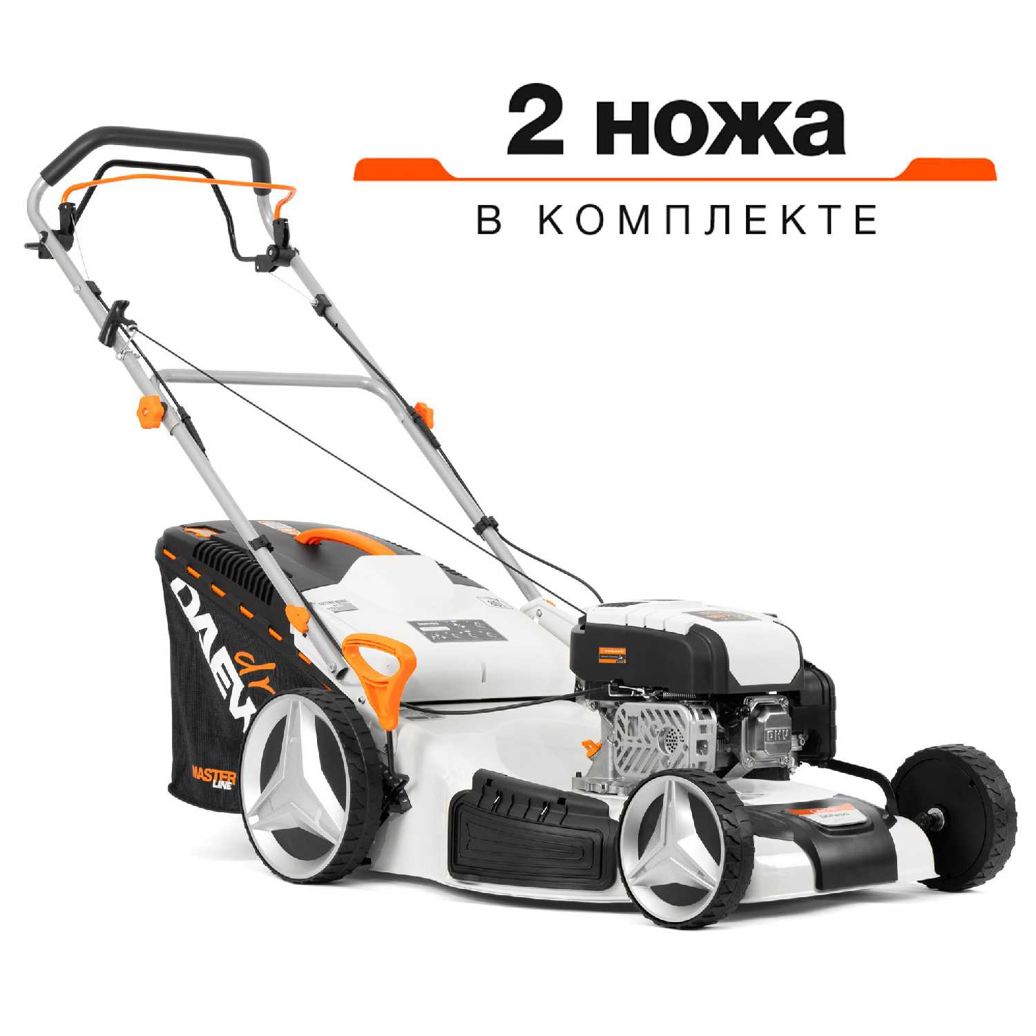 - + Газонокосилка с самой большой шириной скоса в 58 см. Если нужно больше, то только садовые райдеры.