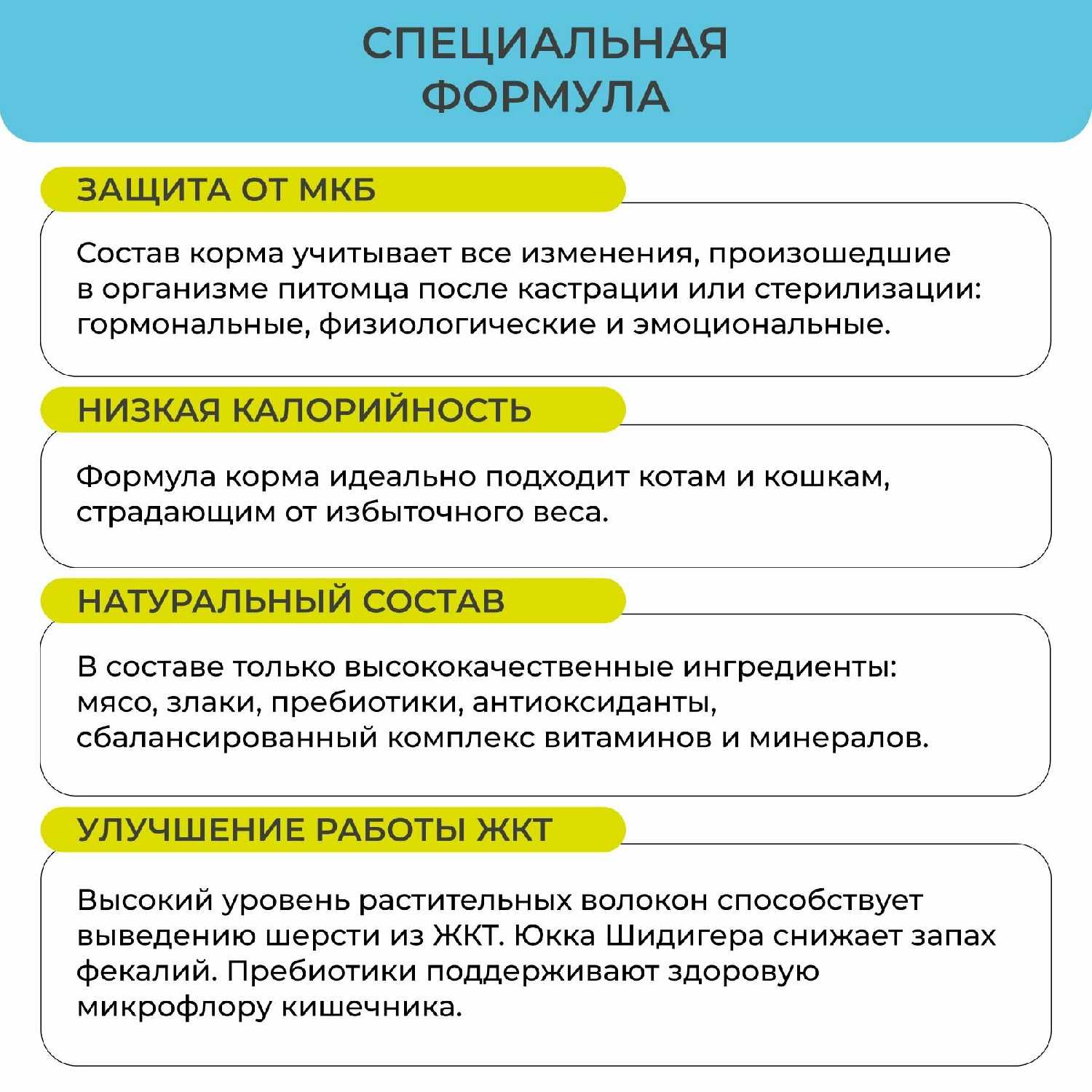 | Особые потребности : | гипоаллергенный, для здоровья кожи и блеска шерсти, для здоровья костей и суставов, для профилактики стресса, для стерилизованных/кастрированных |