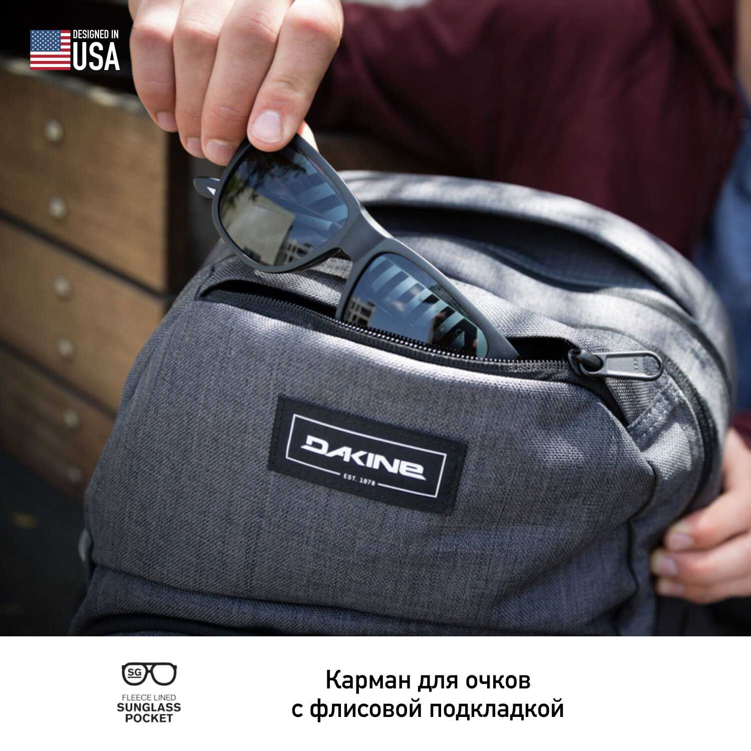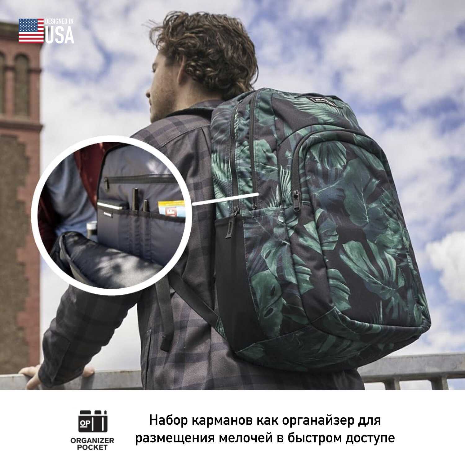 - Многоуровневая система карманов включает изолированный ланч-бокс, флисовый отсек для очков и скрытый антикарманский карман.