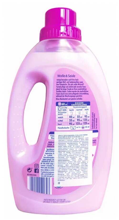 - + Долго искал достойное средство для своих шерстяных вещей. Все-таки хочется попробовать освежить вещи перед зимой без риска того, что они сядут или полиняют. Наконец-то увидел Dalli Wolle&Seide, сделанный специально для шерсти и шелка! У средства приятный аромат и густая консистенция. Я уже успел перестирать им все шерстяные вещи и вот результат - ни одного "брака", все как будто из магазина: пушистые, мягкие с ровной поверхностью, без каких-либо катышков. Далли – это прекрасное средство для обновления шерстяных изделий, распутывания легких катышков и удаления поверхностных пятен. И что немаловажно, никакого кондиционера после стирки уже не требуется. Всем хороших и приятных стирок!