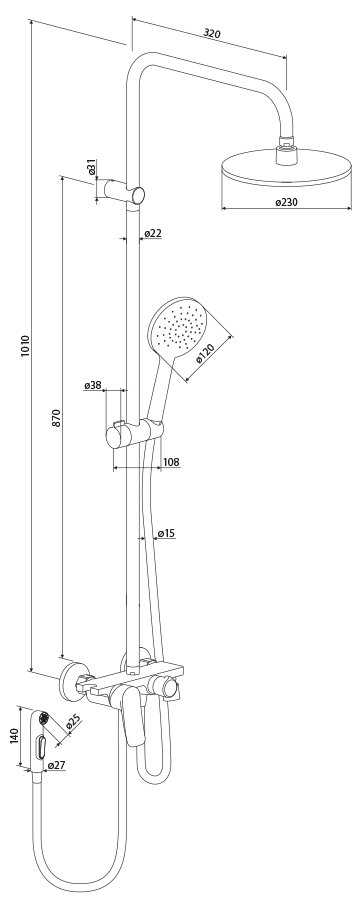 | Комплектация : | вентиль, верхний душ, гигиенический душ, держатель лейки, душевая стойка, душевая штанга, излив для набора воды, кронштейн, кронштейн для верхнего душа, лейка, мыльница, набор эксцентриков, переключатель потоков, полочка, ручной душ, смеситель, шланг, эксцентрик |