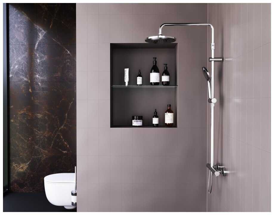 | Особенности : | S-образные эксцентрики, антиизвестковое покрытие, держатель душевой лейки, защита от обратного потока, защита от скручивания, регулируемый верхний душ |