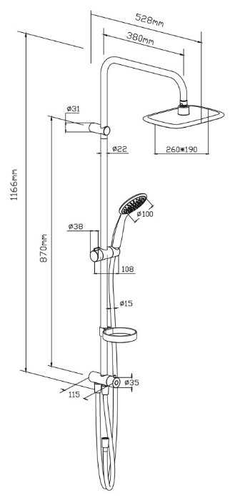 | Дополнительная информация : | высота стойки для душа: 1166 мм, диаметр душевой лейки: 100 мм, длина верхнего душа: 190 мм, ширина верхнего душа: 260 мм |