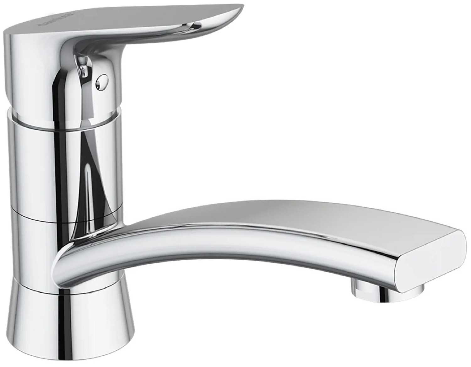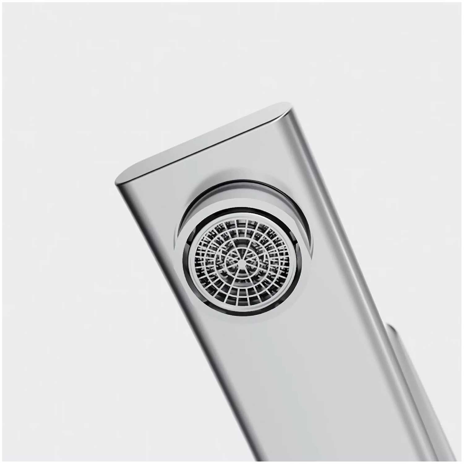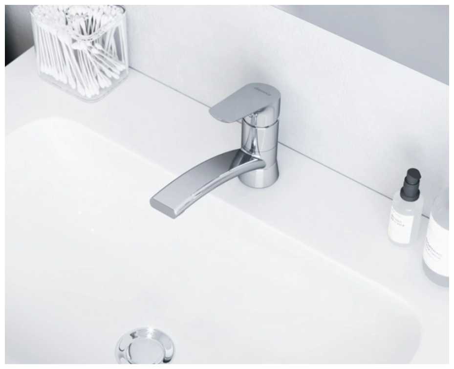 - + Очень элегантная и стильная форма смесителя. Есть небольшой наклон корпуса в сторону центра раковины, что облегчает использование.
