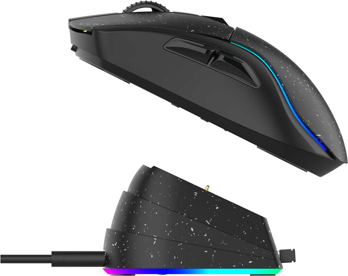 Аккумулятор ёмкостью 900 мАч обеспечивает до 10 дней работы при активном использовании (8–10 часов/день), а док-станция с магнитным креплением сокращает время зарядки до 1,5 часов. Пользователи подчёркивают, что даже при 20% заряда мышь функционирует 4–5 часов, а возможность подзарядки через USB-C кабель (в комплекте) страхует от разрядки. Однако размещение аккумулятора в задней части создаёт дисбаланс: вес 88 г ощущается как 100+ г, что критично для фанатов лёгких моделей (60–70 г). Для нишевой аудитории, предпочитающей «тяжёлую» эргономику (например, поклонников мышей Razer Basilisk), это становится преимуществом. Док-станция дополнительно оснащена USB-портом для подключения приёмника, снижая расстояние передачи сигнала.