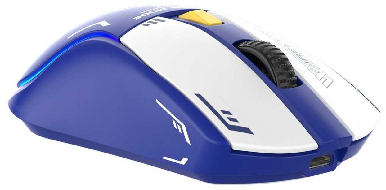 Мышка очень красиво выглядит, прямо бросается в глаза после типичных красных черных игровых устройств. кнопки очень отзывчивые, особенно боковые кнопки, они далеко выступают, у них большой ход, но при этом мягко прожимаются. В комплекте есть нескользящие наклейки черного цвета. Не советую мышь для любителей хвата ладонью и для последователей Бориса Бритвы, для которых "Тяжесть это хорошо. Тяжесть это надёжно", так как мышь очень низкая и лёгкая