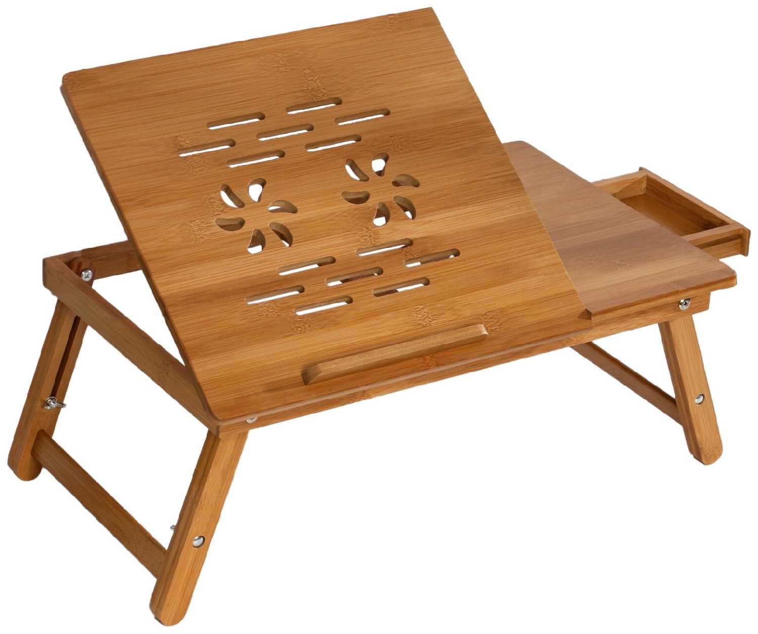 - + Хорошее качество, аккуратно сделан. Лёгкий, небольшой, складной. Регулируемые по высоте ножки. Регулируемый угол наклона столешницы.