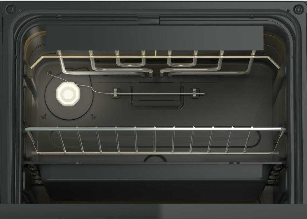 Особенности конструкции : | вертел, дисплей, подсветка духовки, чугунные решетки, ящик для посуды |