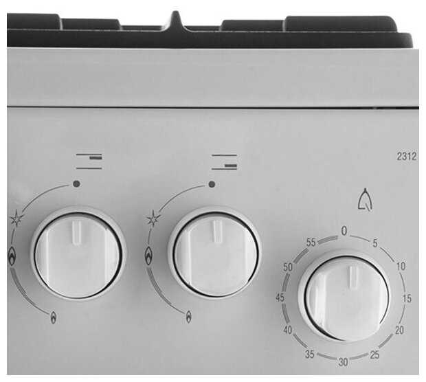 - Поворотные ручки управления газом оснащены функцией фиксации в положении минимального пламени, что удобно для томления блюд без постоянного контроля.