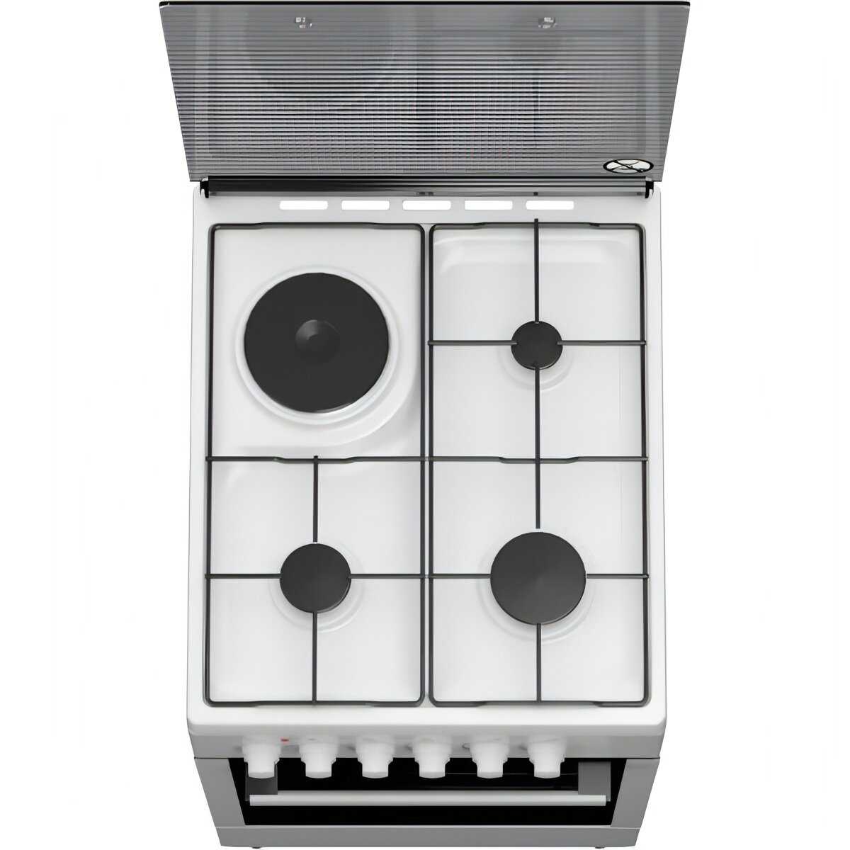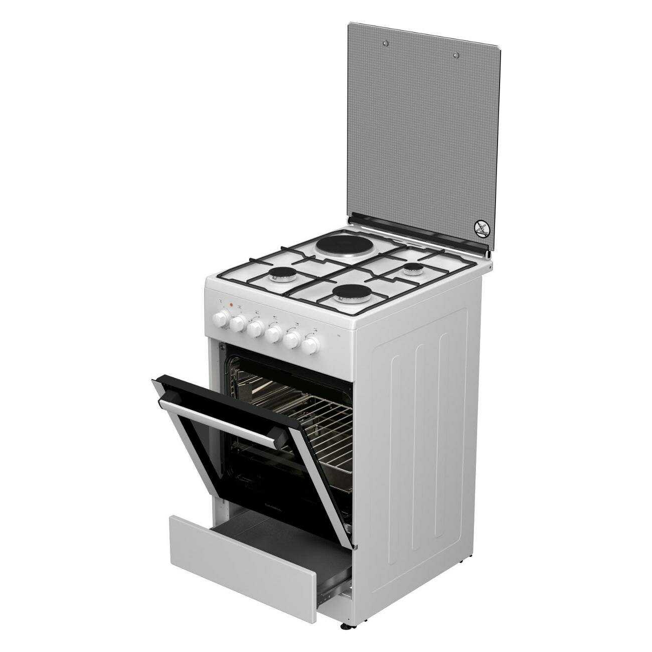 Корпус и панели: Плита выполнена из толстого металла, что ассоциируется у пользователей с надежностью и долговечностью. Стеклянная крышка варочной поверхности функциональна и легко моется, защищая стену от брызг. Однако качество сборки может быть неидеальным: встречаются отзывы о люфтах поворотных ручек управления, которые не влияют на функционал, но снижают тактильное удовольствие от использования по сравнению с плитами более высокого ценового сегмента. Также возможны незначительные перекосы дверцы духовки или выдвижного ящика для посуды.