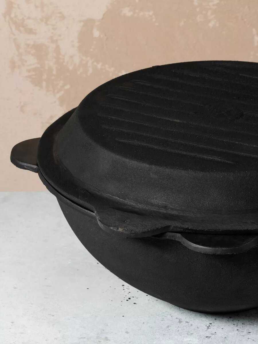 - Чугун выдерживает высокие температуры для аутентичной готовки.