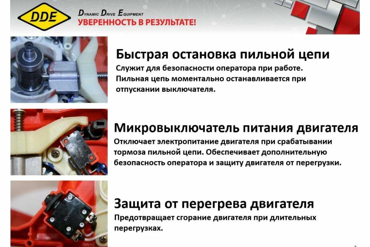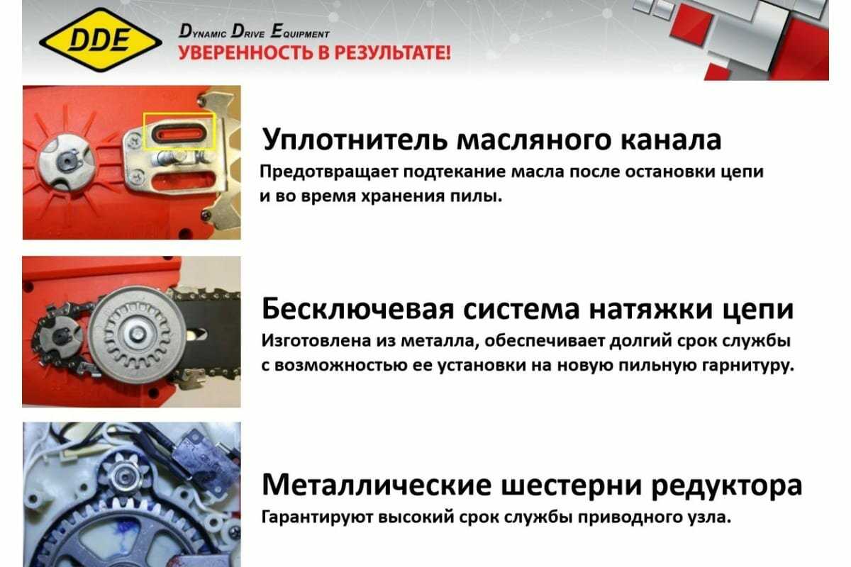 Особенности конструкции : | антивибрационная система, бесключевая замена оснастки, блокировка кнопки включения, прорезиненная рукоять, регулировка натяжения цепи без инструмента |
