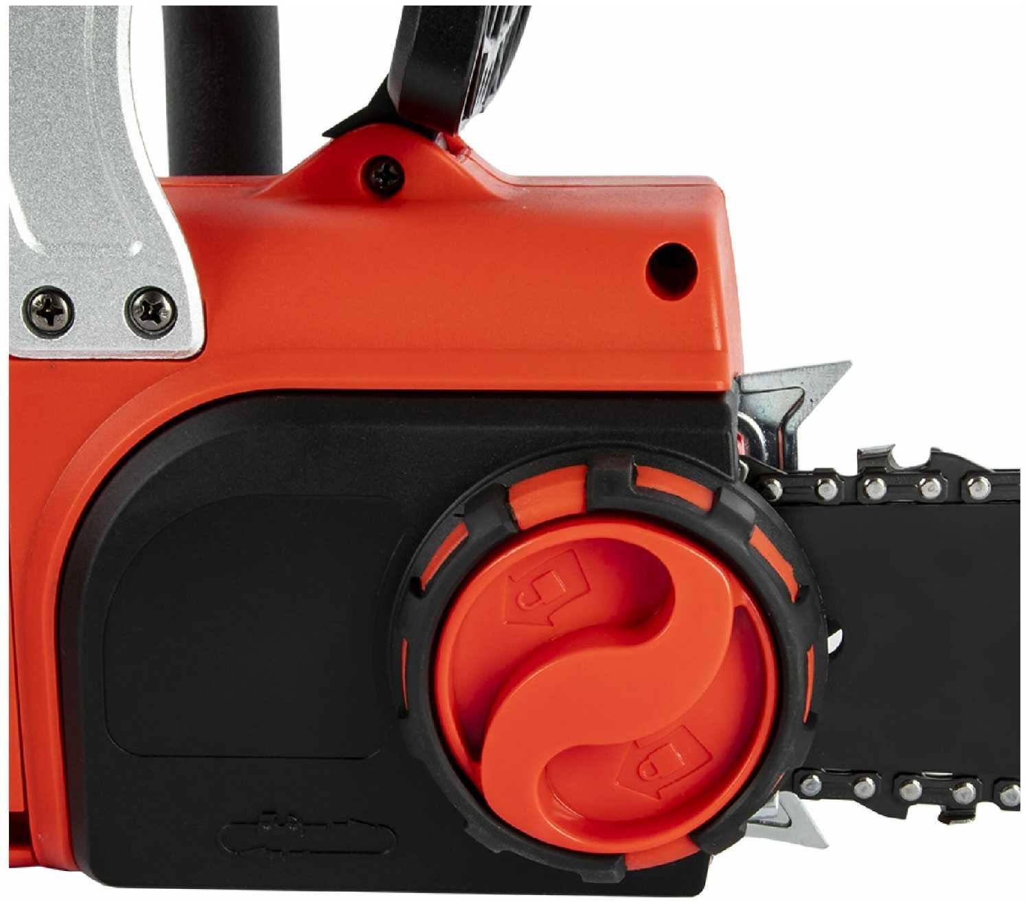 Натяжение цепи регулируется без инструментов за 3–5 секунд: достаточно ослабить фиксирующую ручку, повернуть кольцо и затянуть обратно. Однако механизм считается хлипким — болты крепления шины могут деформироваться или сорваться при частой подтяжке, а гайки начинают прокручиваться. Пользователи отмечают необходимость постоянной корректировки натяжения, иногда после каждого распила. Несмотря на удобство, долговечность узла низкая, особенно при интенсивной эксплуатации. -