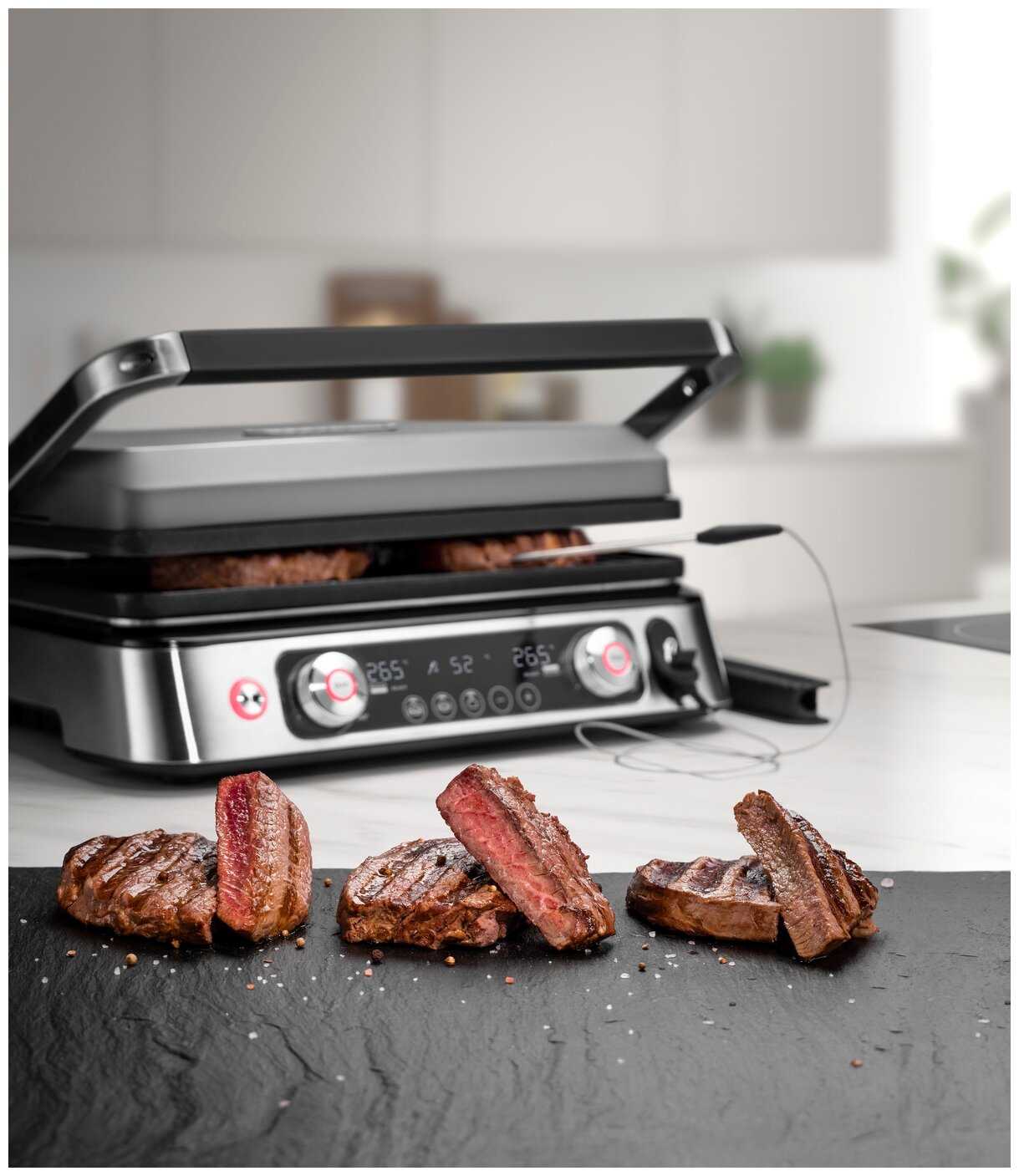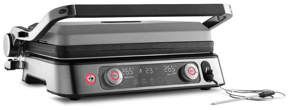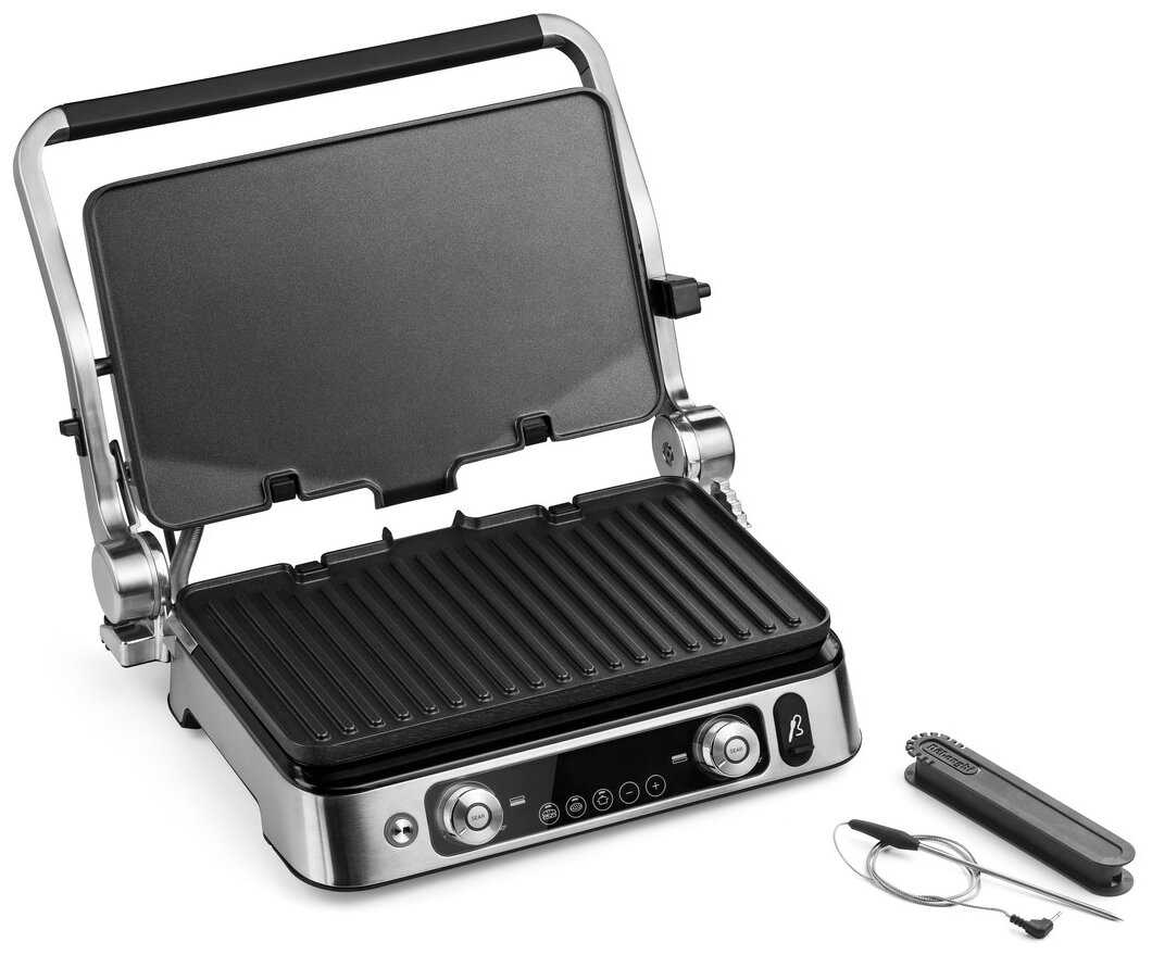 - + Отличный гриль, большая поверхность для размещения продуктов. Можно за раз приготовить например 4 бургера, на одной стороне разогревая булочки, на другой жаря котлетки, при этом выставив для каждой пластины свою температуру. Тяжелая верхняя половина гриля, хорошо прилегает к продукту. Стейки получаются просто изумительные, а за счет идущего в комплекте термощупа, легко добиться нужной степени прожарки. Легко очищается. Быстро набирает заданную температуру. Лучший подарок на новый год.