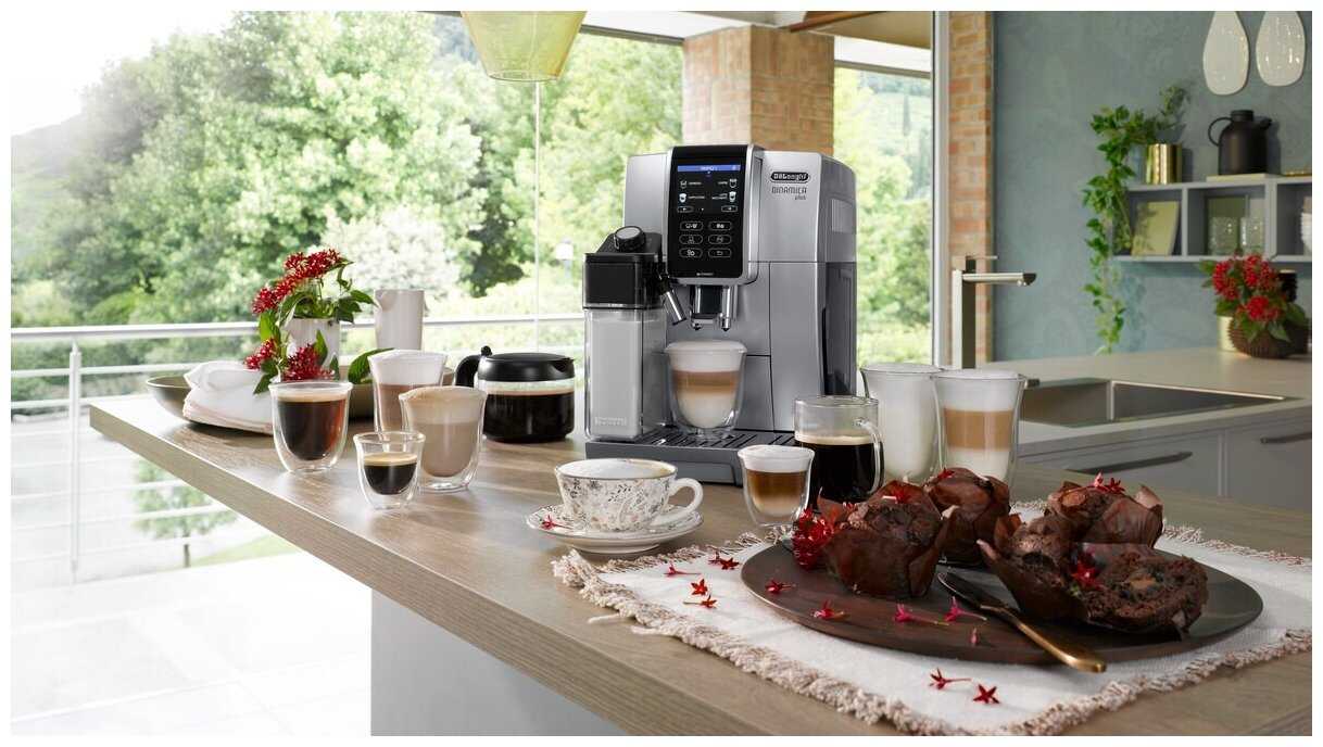 кофемашина, съемный поддон для капель, фильтр для воды, кувшин для молока, ложка-дозатор для молотого кофе, индикаторная полоска “Total Hardness Test”, средство для удаления накипи, инструкция