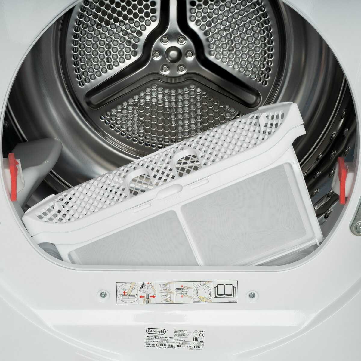 Машина эффективно собирает пыль, ворс и шерсть животных с одежды, что особенно заметно при сушке пледов и вещей домашних питомцев. Фильтр требует регулярной очистки после каждых 2-3 циклов сушки из-за значительного количества оседающих частиц. Также необходимо периодически сливать конденсат из бачка для поддержания эффективной работы. -