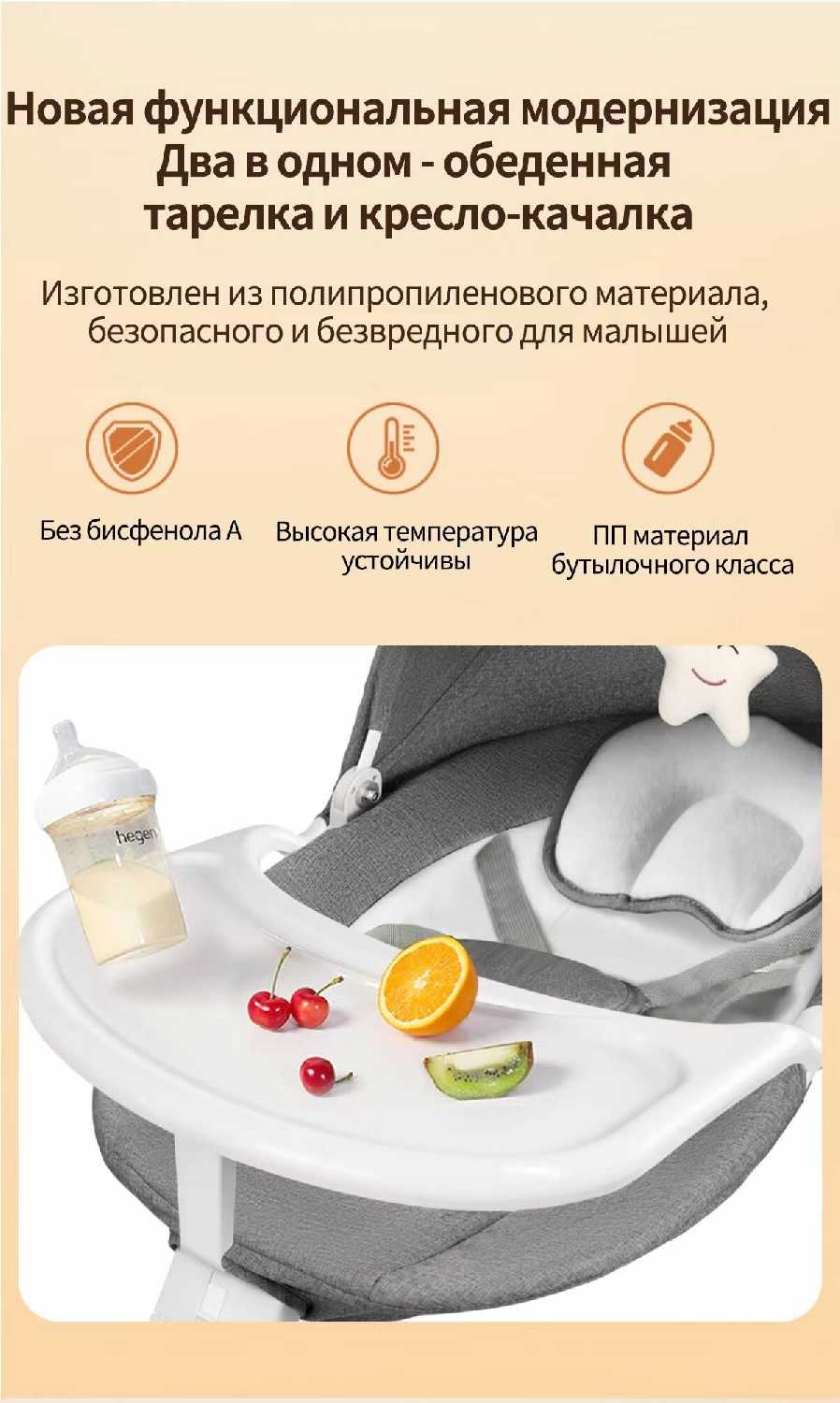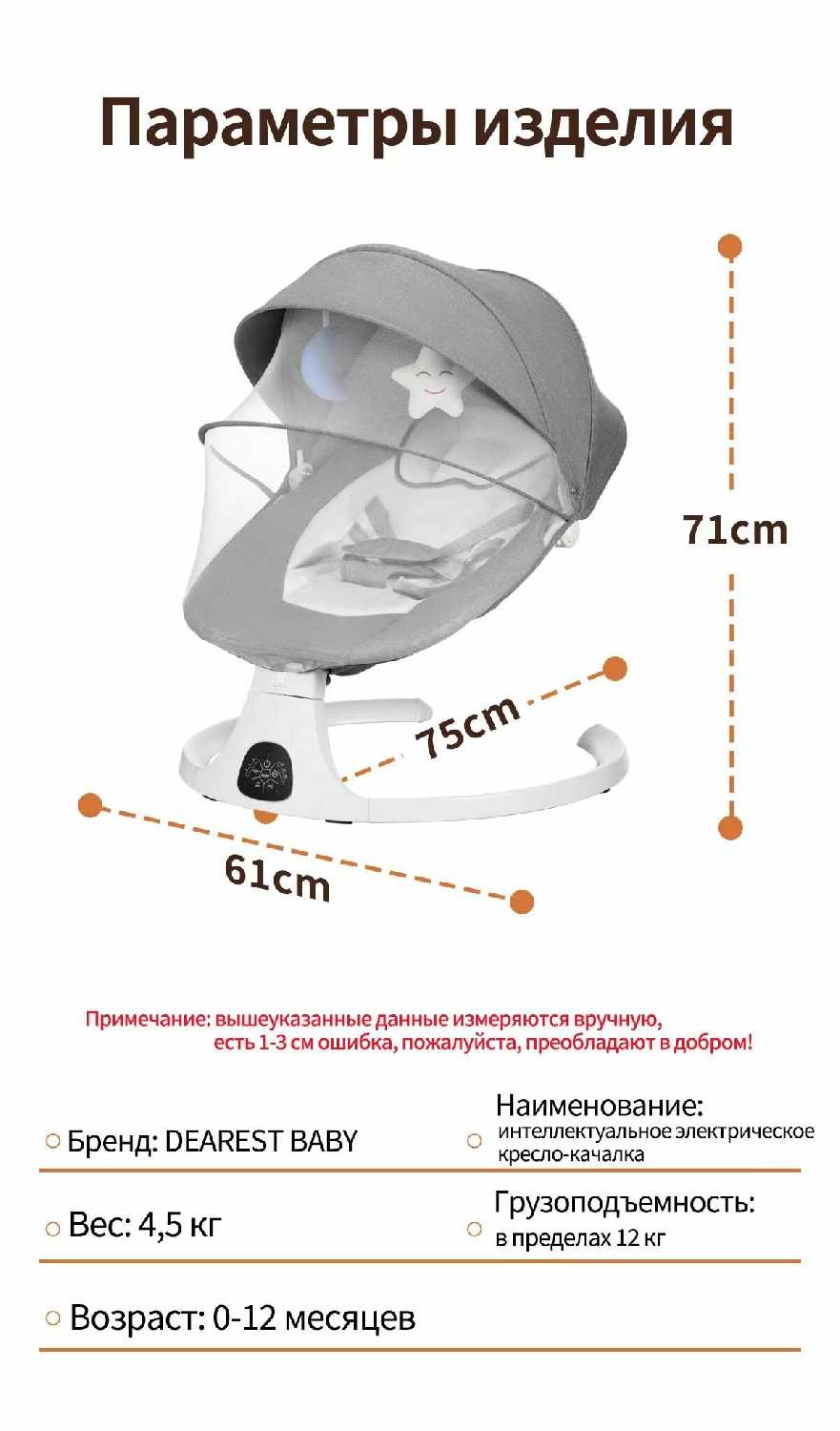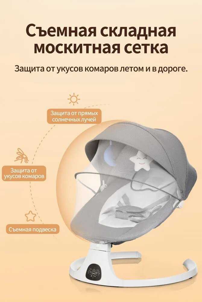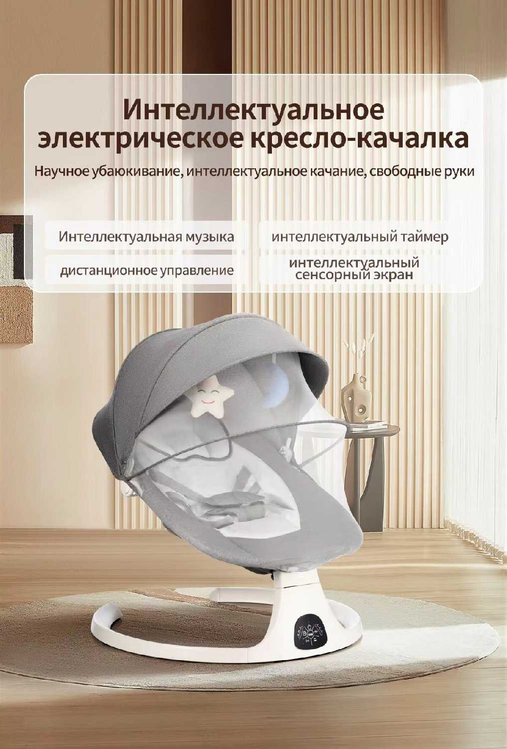- Электромеханический привод обеспечивает автономное качание, освобождая руки родителей для других задач.