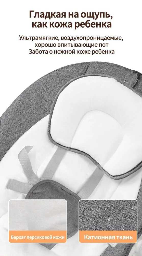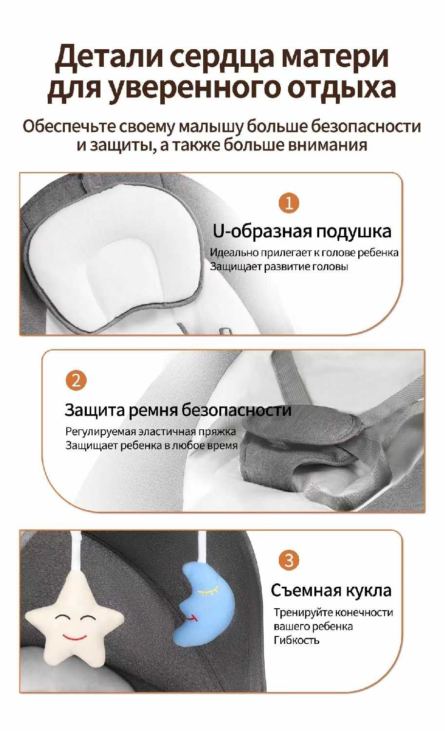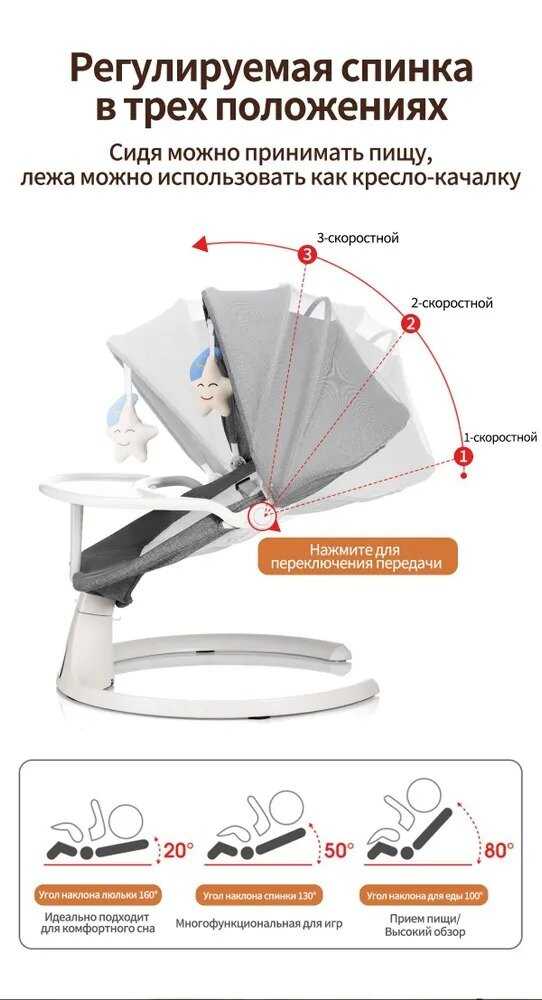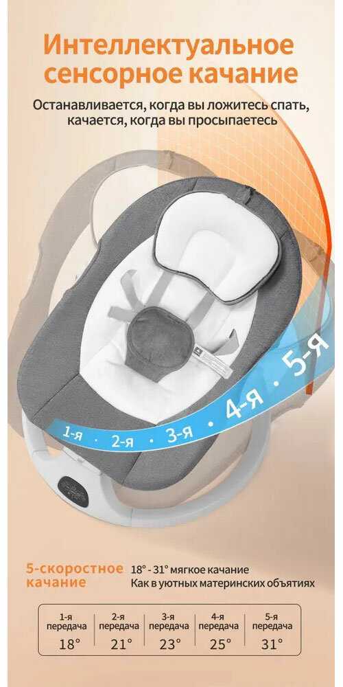 - Регулируемая скорость колебаний позволяет подобрать интенсивность укачивания под индивидуальные предпочтения ребенка.