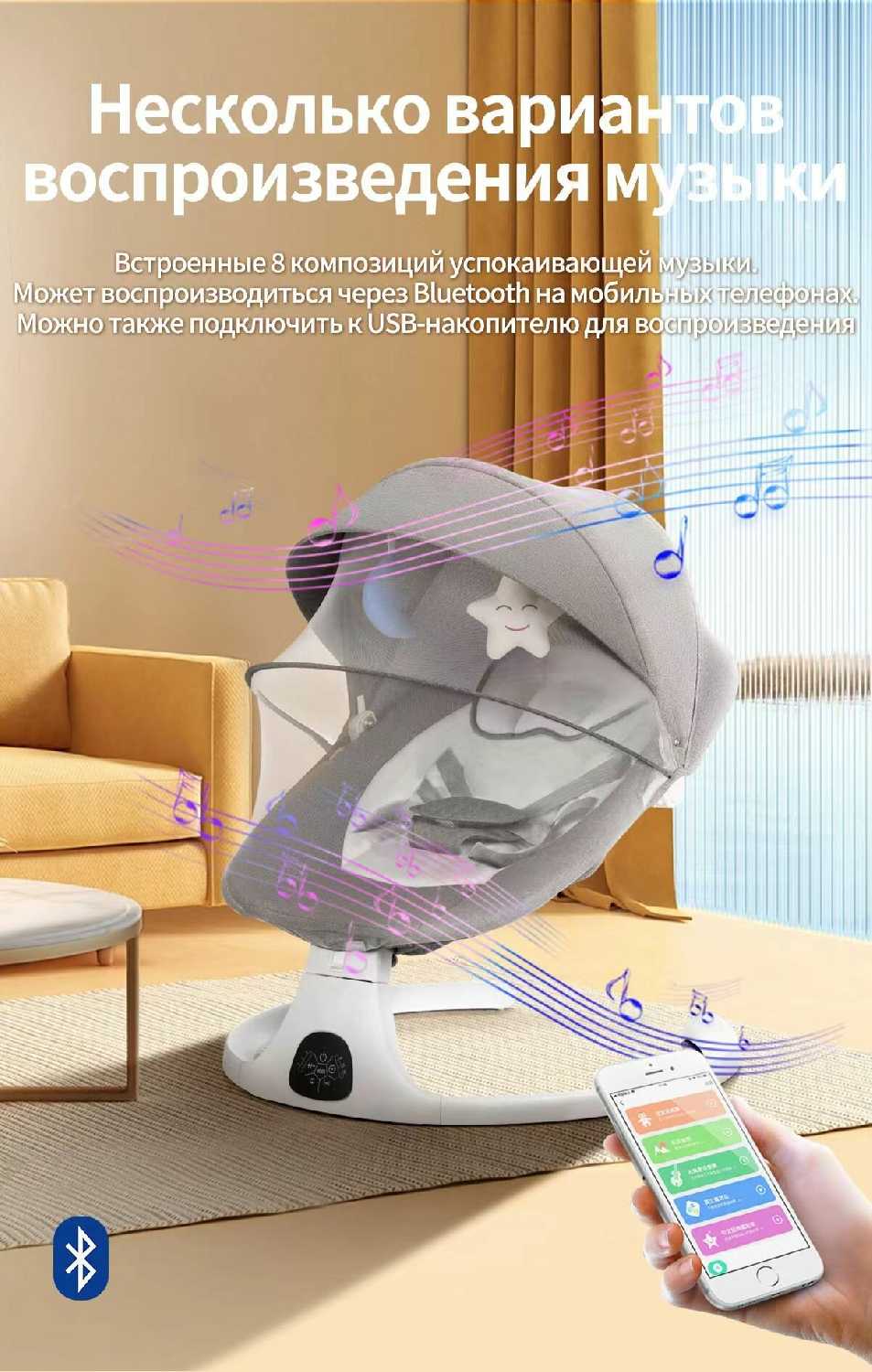 Музыкальный блок оснащен встроенными мелодиями (около 5 штук) и возможностью подключения по Bluetooth для воспроизведения музыки с внешнего устройства. Громкость можно регулировать. Однако есть жалобы на то, что музыка может самопроизвольно отключаться через 5 минут, а динамик иногда характеризуется как тихий и хрипящий. Функция "умного укачивания", судя по отзывам, отсутствует, несмотря на наличие соответствующей кнопки. -