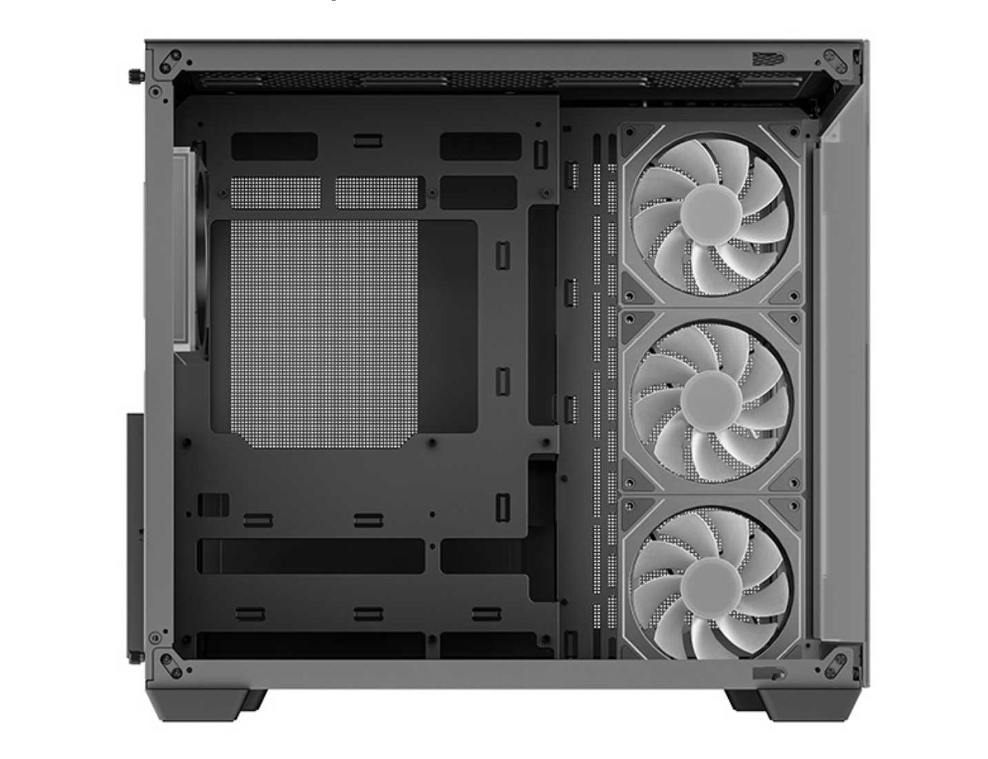 Модель предлагает исключительную вместимость для формата mid-tower. Внутри свободно размещаются полноразмерные ATX-материнские платы (например, MSI PRO Z690-A), башенные кулеры высотой до 175 мм (включая DeepCool AK620) и видеокарты длиной 330-350 мм (тестировались с RTX 4080/4090) с запасом пространства для циркуляции воздуха. Отсек блока питания рассчитан на устройства длиной до 190 мм, а съёмная корзина для HDD с двумя позициями регулировки упрощает монтаж. Особо отмечены быстросъёмные крепления SSD на тыльной стороне материнской платы, не требующие инструментов. Ограничением является невозможность вертикального монтажа видеокарты из-за бокового расположения БП, а трёхсекционные СЖО 360 мм устанавливаются только фронтально.