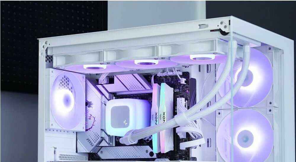 - ARGB-подсветка на помпе и вентиляторах настраивается через материнку, выглядит эстетично в стеклянных корпусах, белый вариант не желтит.