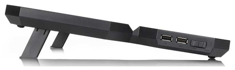 + Кабель питания идеально помещается между подставкой и ноутбуком, в выемку между рядами больших и малых кулеров.