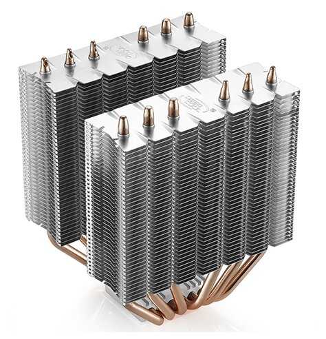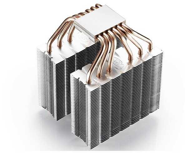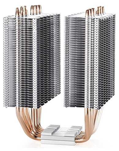 Простая и эффективная конструкция для отвода тепла от процессора. Используется медное основание, а также 6 медных трубок которые проходят через два больших алюминиевых радиатора.