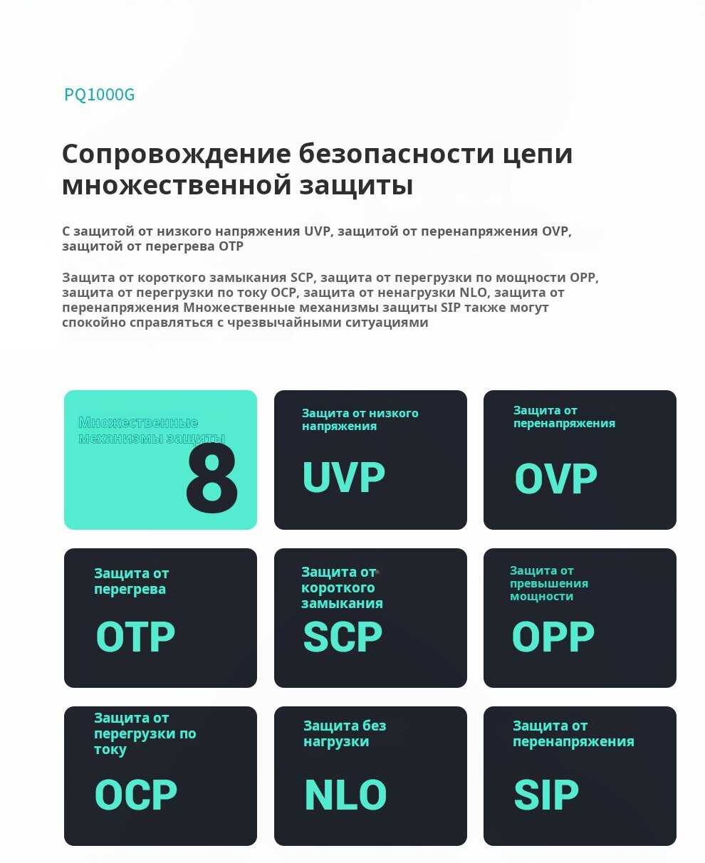 Блок оснащен полным набором защит: OCP (от перегрузки по току), OVP (от перенапряжения), UVP (от пониженного напряжения), OPP (от превышения мощности), SCP (от короткого замыкания) и OTP (от перегрева). Защиты корректно срабатывают при скачках напряжения в сети, предотвращая повреждение компонентов системы. Пользователи подтверждают эффективность работы защитных систем в реальных условиях эксплуатации. -