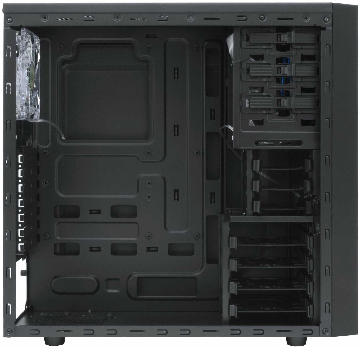 Штатный вентилятор на задней стенке обеспечивает базовую циркуляцию, но для эффективного охлаждения рекомендуется установка дополнительных кулеров. Оптимальная схема: два вентилятора спереди на вдув, один сзади на выдув и один на боковой стенке. При этом верхние слоты часто остаются незадействованными из-за шума и слабого влияния на температуру. -