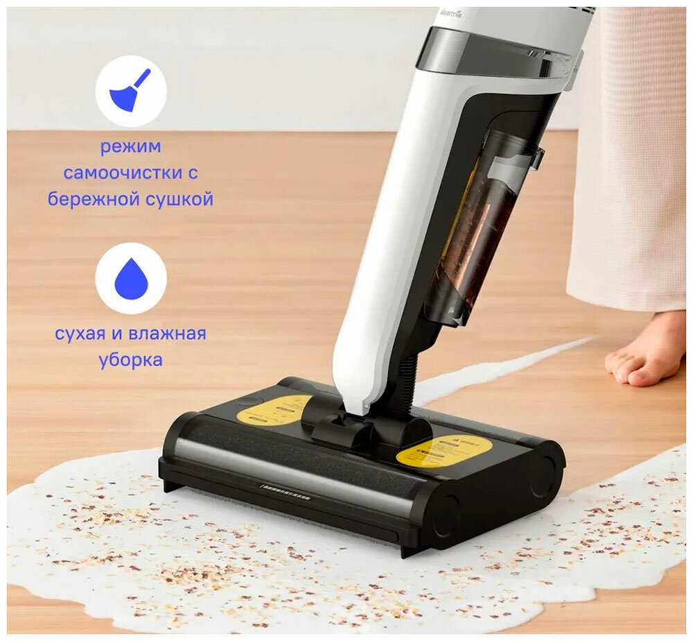 Пол действительно чистый после уборки, ходила мокрыми ногами по всей квартире, не прилипло ничего, подошва осталась чистой. Легко моется резервуар с грязной водой/мусором.