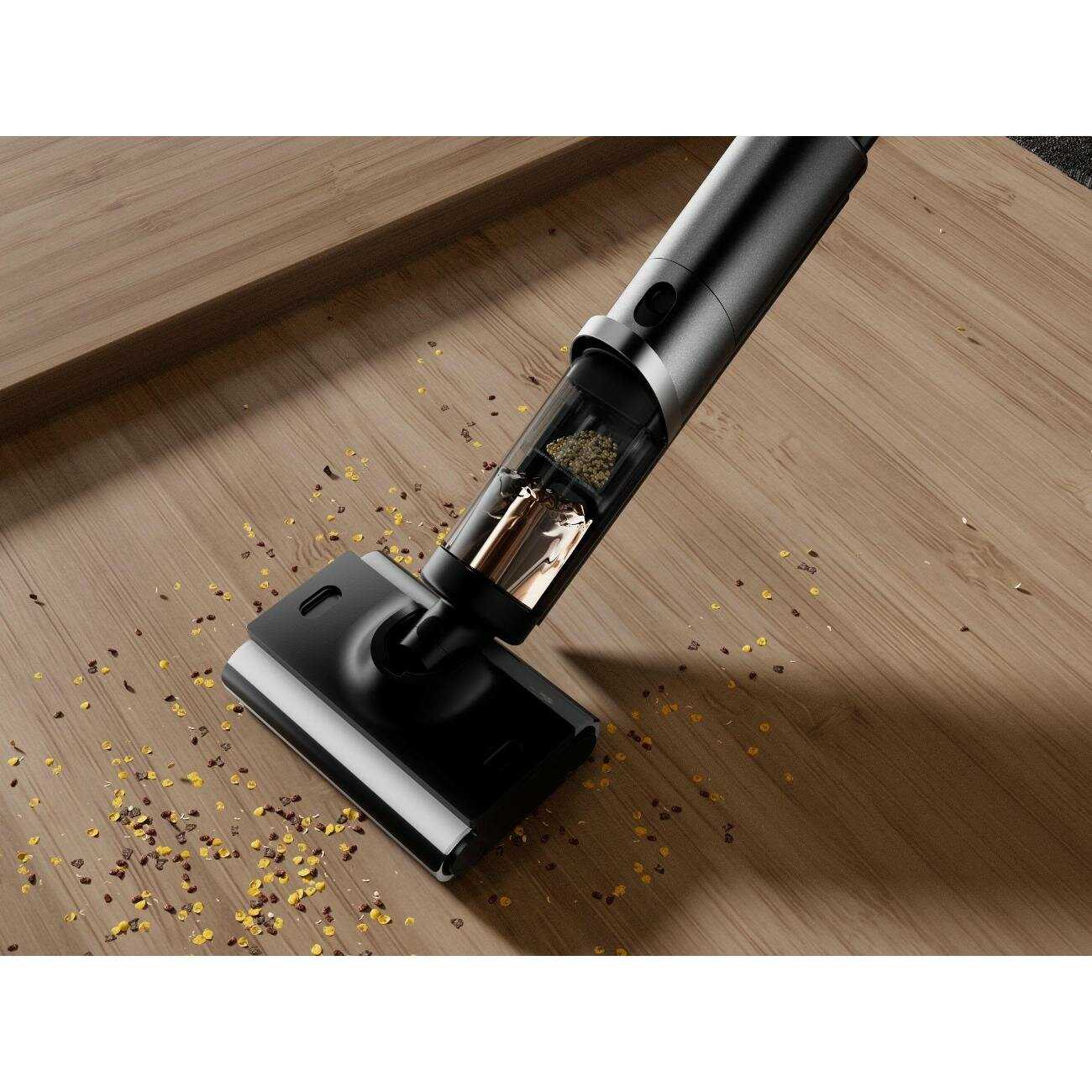 - Комбинированная функция пылесоса и мойки сокращает время уборки, собирая жидкие загрязнения вроде чая или компота в один проход.