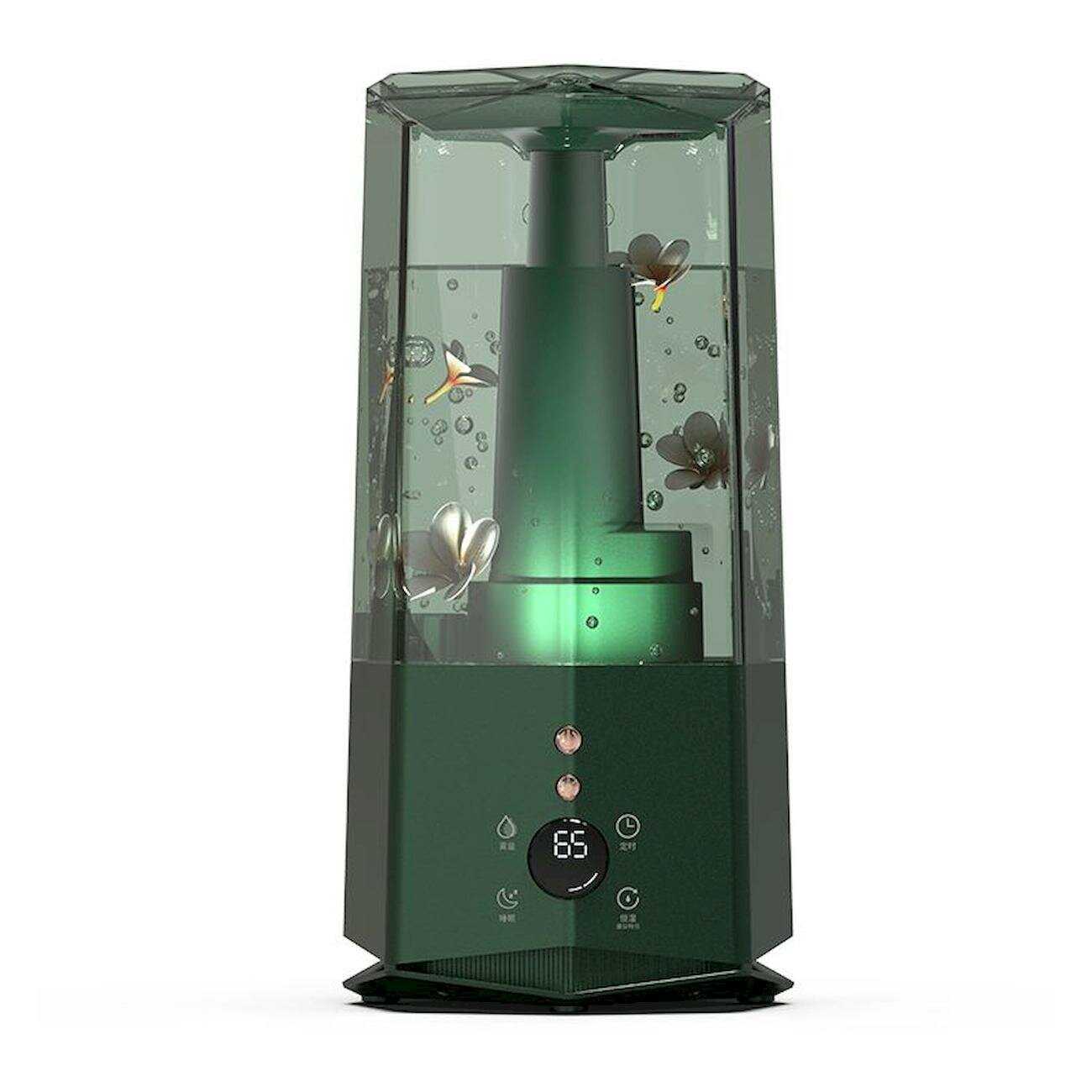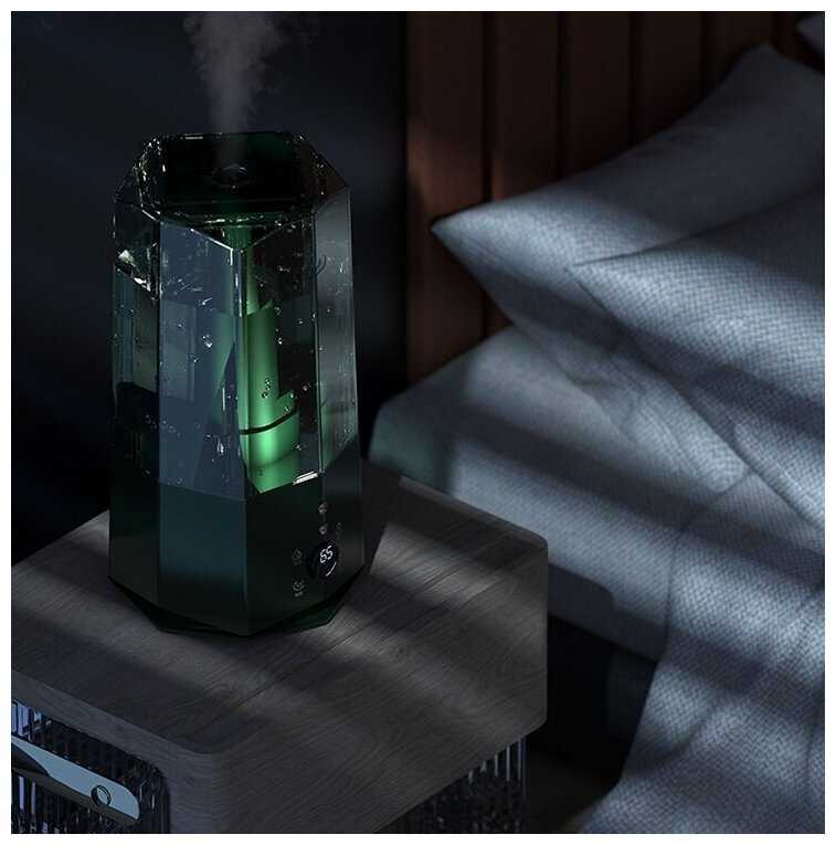Ключевое преимущество – верхний долив воды без необходимости снимать резервуар. Прозрачный корпус позволяет контролировать уровень жидкости. Сенсорное управление включает 3 режима влажности, ночной режим с приглушённой подсветкой и таймер отключения до 12 часов. Ножки устойчивы к скольжению. -