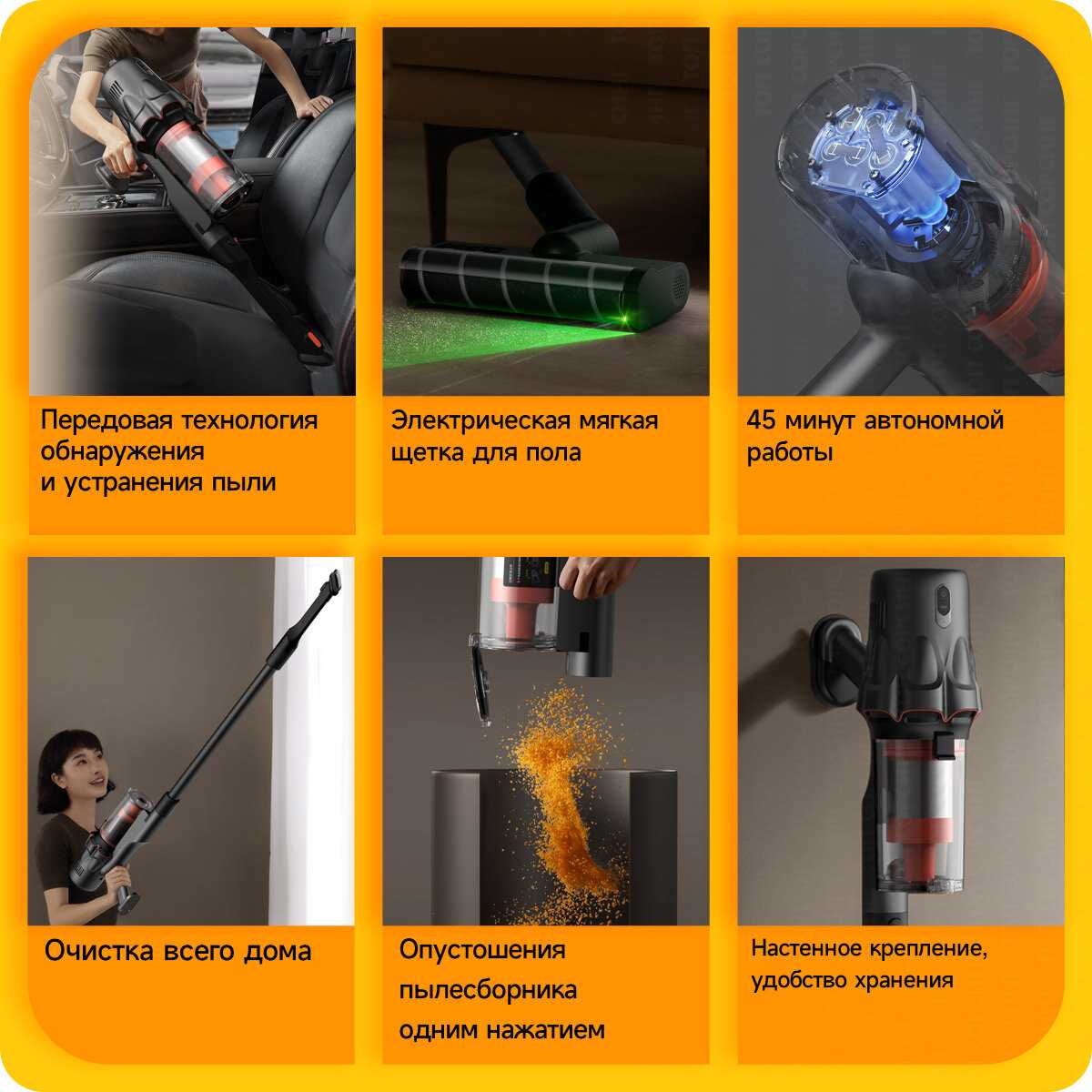 Благодаря компактной конструкции и маневренной щетке пылесос легко проникает под низкую мебель, включая диваны и кровати. Пользователи особо выделяют способность устройства практически полностью "погружаться" под мебель, обеспечивая тщательную уборку в труднодоступных местах. Подсветка в зоне уборки дополнительно помогает видеть скрытый мусор под мебелью. Эта особенность делает его идеальным для поддержания чистоты в сложных участках квартиры. -