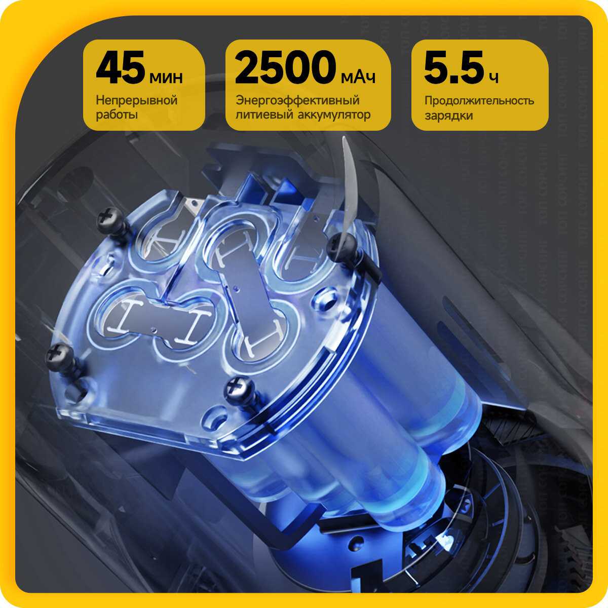 - Зарядка держит 40-45 минут непрерывной работы, позволяя убрать квартиру 75 кв.м. плюс лоджию без перерыва.