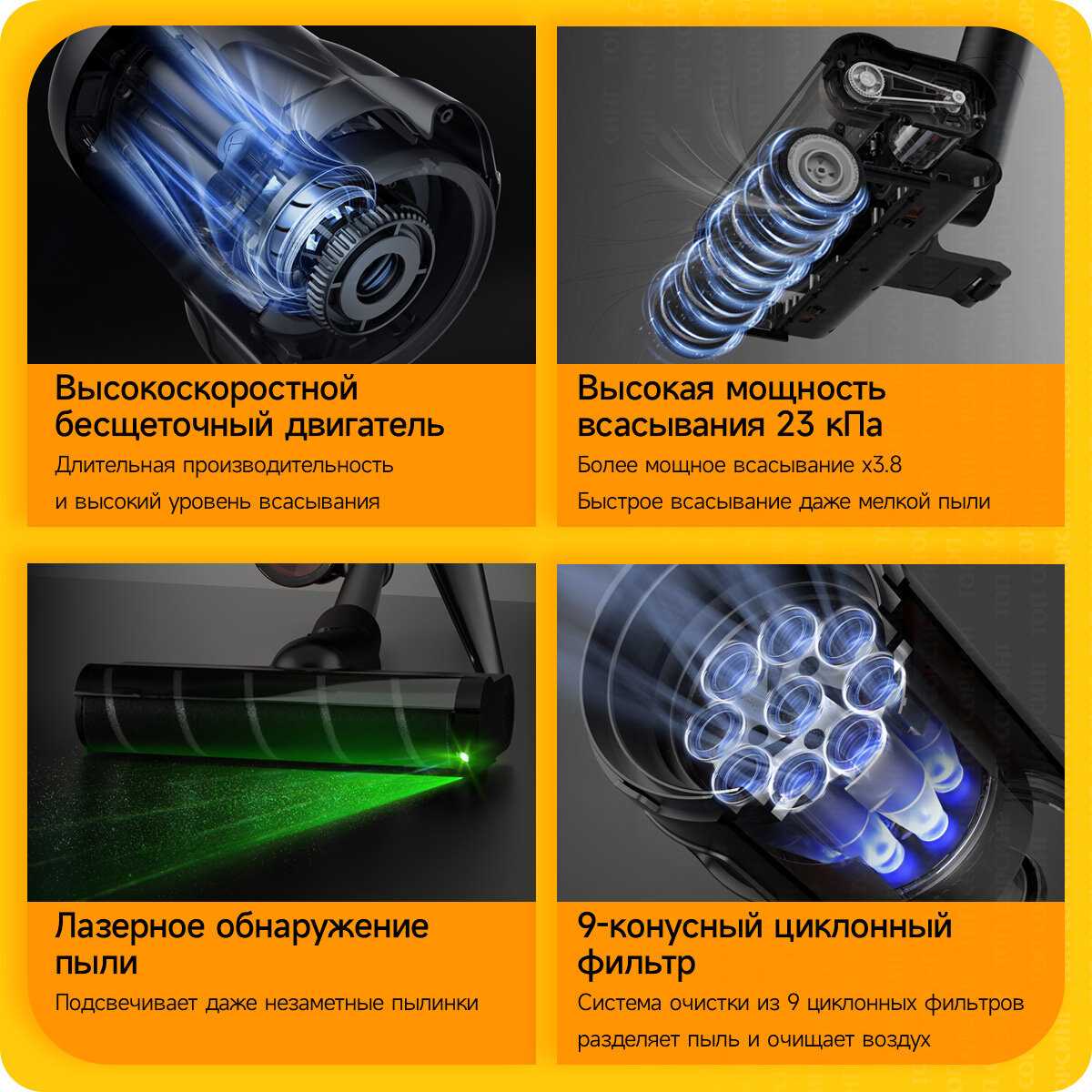 - Не требует отключения во время ночных или тихих уборок, повышая удобство спонтанной чистки.