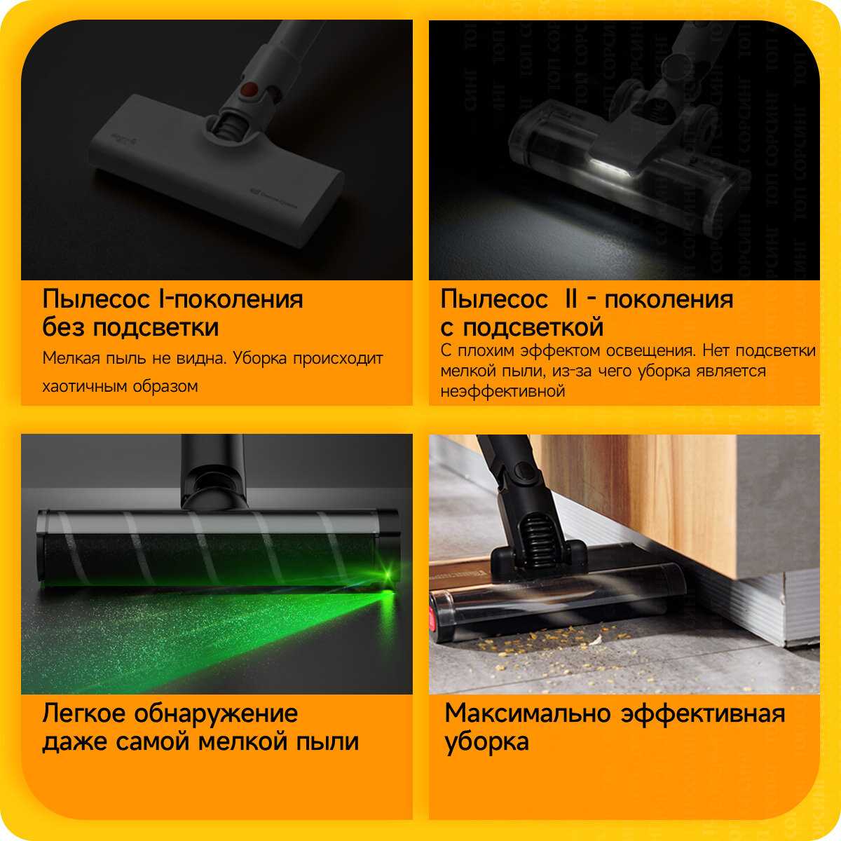 Эффективность на разных покрытиях: Пользователи подтверждают стабильную работу на гладких поверхностях (линолеум, плитка) и коврах с низким ворсом благодаря вращающейся щётке, подхватывающей крошки и пыль. Однако на коврах с длинным ворсом или придверных ковриках наблюдается недостаточное всасывание шерсти животных из-за отсутствия специализированной щеточной полосы. Турборежим компенсирует этот недостаток, но сокращает время работы до 10-15 минут. Подсветка насадки существенно улучшает видимость мелкой пыли и шерсти на тёмных поверхностях, что отмечается владельцами домашних животных.