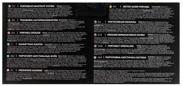 Устройство компактно (высота ≈20 см), но имеет ощутимый вес (≈800 г) из-за двух 10-Вт динамиков и аккумулятора 2000 мАч. Корпус выполнен из ударопрочного пластика с резиновыми вставками. Благодаря скруглённым углам и интегрированной ручке колонку удобно переносить в рюкзаке или держать одной рукой. -