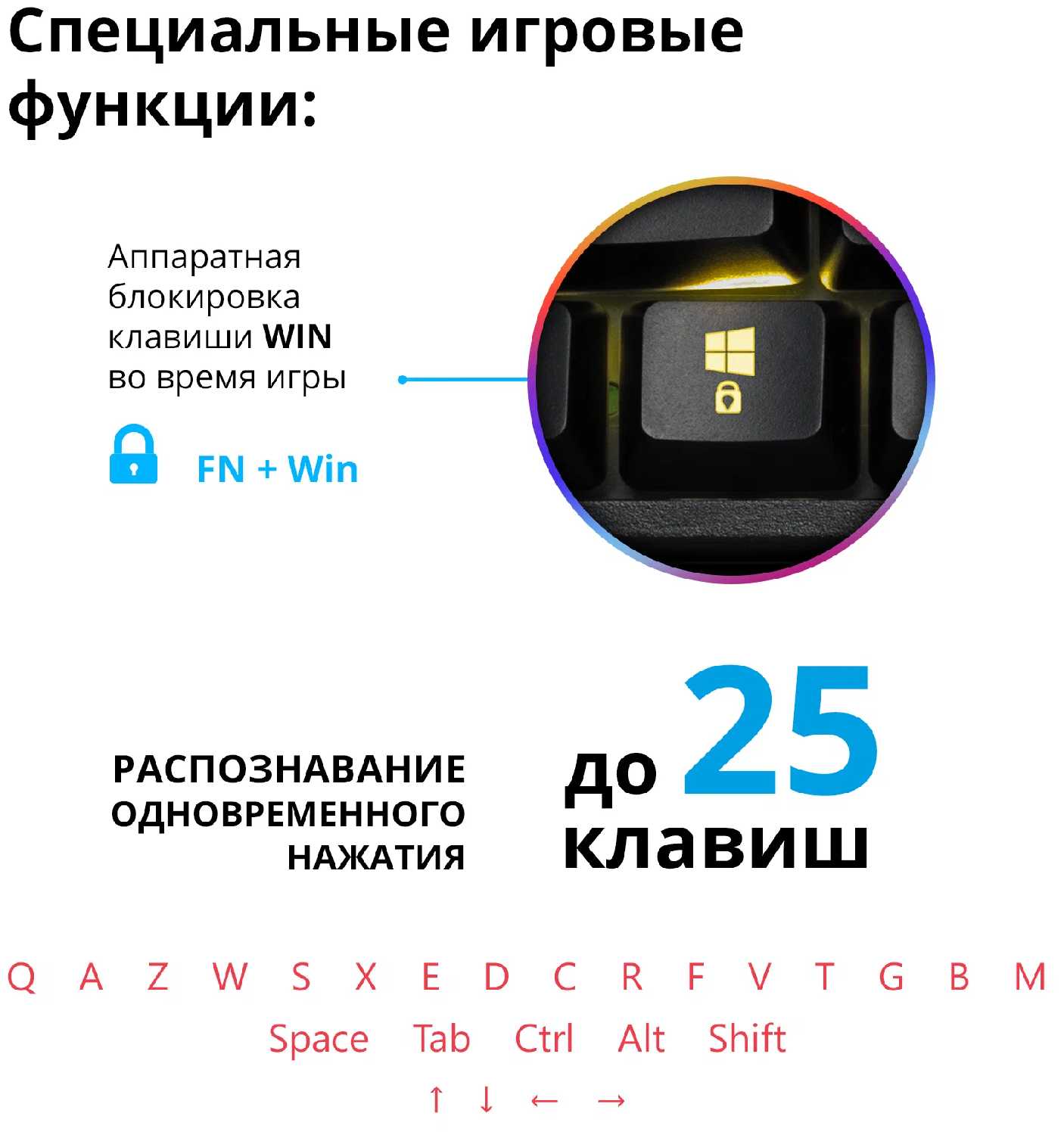 Подсветка и функциональные ограничения Реализация RGB-подсветки вызывает разочарование: вместо истинной per-key подсветки используется зональное распределение статичных цветов (красный/синий/зеленый в разных секциях), а анимированные режимы напоминают "новогоднюю гирлянду" с хаотичным мерцанием. Клавиша переключения режимов расположена неудачно - на месте правого Ctrl, что провоцирует случайные активации во время игр. Боковая синяя подсветка не отключается даже при выключенном ПК, требуя физического отключения клавиатуры или маскировки изолентой. Отсутствует индикация ScrollLock и состояния WinLock, а блокировка клавиатуры (Fn+F11) не сопровождается визуальным подтверждением.