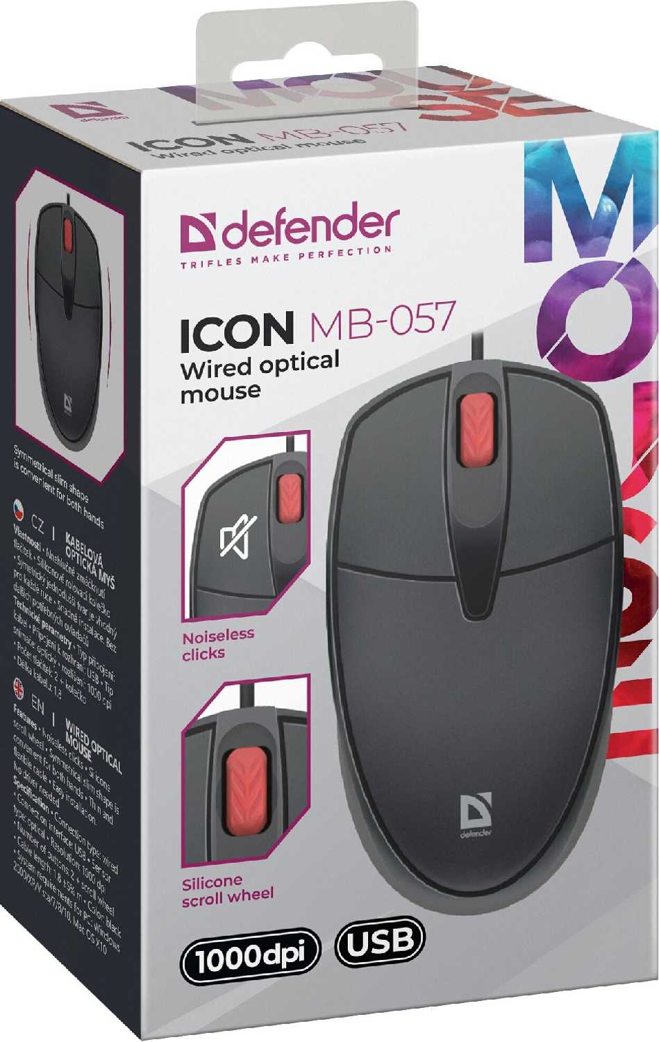 | Комплектация : | Мышь Defender Icon MB-057, бесшумная, USB, черный, 3btn+Roll |