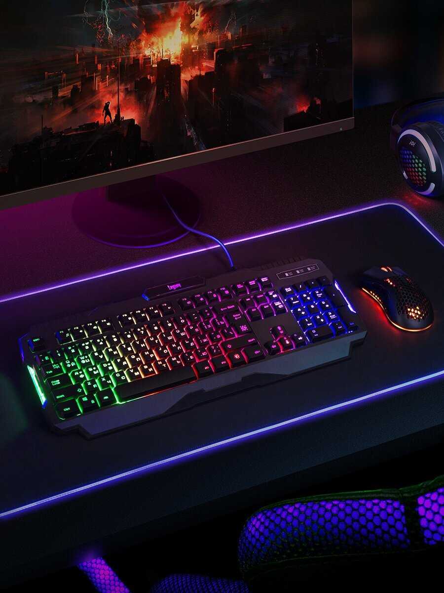 - + Клавиатура обладает разноцветной подсветкой, в темноте светится шикарно, но со временем такая светомузыка может начать надоедать. Ход клавиш легкий. Клавиатура большого размера, на столе стоит надежно ,не передвигается.