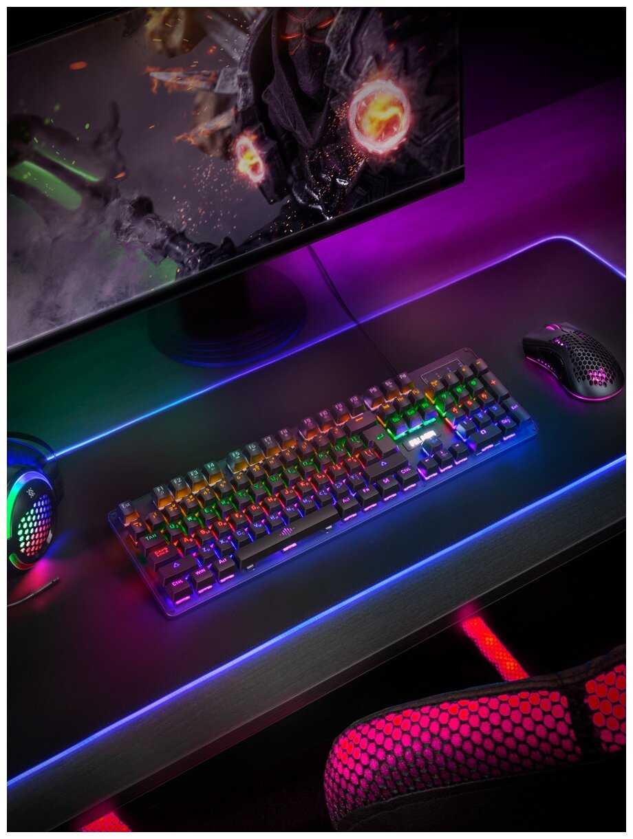 - Четкое тактильное срабатывание синих механических переключателей с характерным щелчком, обеспечивающим уверенность регистрации нажатия.