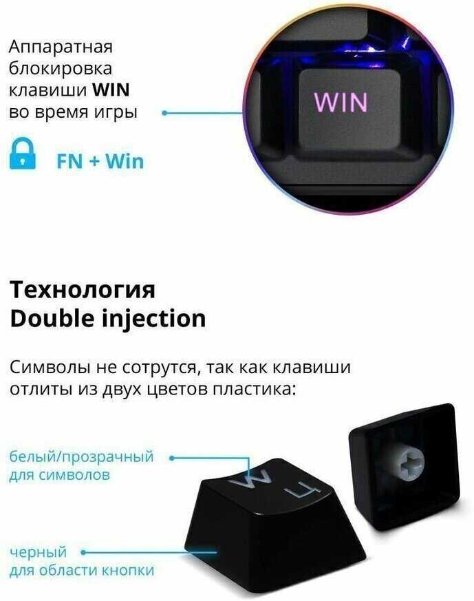 - Двойная литьевая формовка клавиш (Doubleshot ABS), предотвращающая истирание символов.