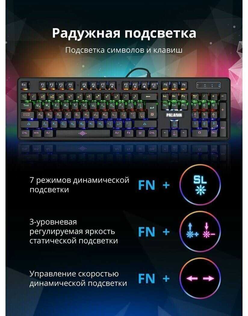 жуть. Шумная, вонючая (некачественный пластик, мзфк), с абсолютно бестолковой подсветкой. Да ещё эта надпись бьёт в глаза, никак не отключить, хоть заклеивай. Клавиши нажимаются все с разным ходом, нажатия то проходят, то нет (печатаю этот отзыв на ней, и через слово приходится править текст, жуть. Русский текст мельче английского, при этом при подсветке слабо различим, синие клавиши так вообще не видны, плюс к тому же странная прорисовка некоторых букв, что тоже плохо читается. Этот ужасный звук! Ощущение, что печатаешь на печатной машинке! Ночью народ будит! Подсветка. *. Покупал именно из-за подсветки чтобы работать ночью. Так вот, подсветка никакая: либо все цвета радги, можно с переливами, либо никакой. Обычной нейтрально подсветки клавиш попросту нет! Мне её что, на ёлку вешать вместо гирлянды? Говнище ужасное, уж прошу прощения за лексикон. И ещё эта жудкая надпись Плладин светится постоянно. Да, да, вне зависимости от включения и выключения подсветки! Мерзейшее исполнение. Отдельно о пластике: это просто дно. Руки прям надо мыть после работы на клаве. Как после дешевой китайской пластиковой игрушки. Иначе запах пластика на ужасный. Купил несколько месяцев назад, использую неделю как. Желание одно: выкинуть и больше такое не брать . И написать этот отзыв на всех остальных сайтах. За 500 руб. обычные клавиатуры с подсветкой справятся лучше, чем это говно.