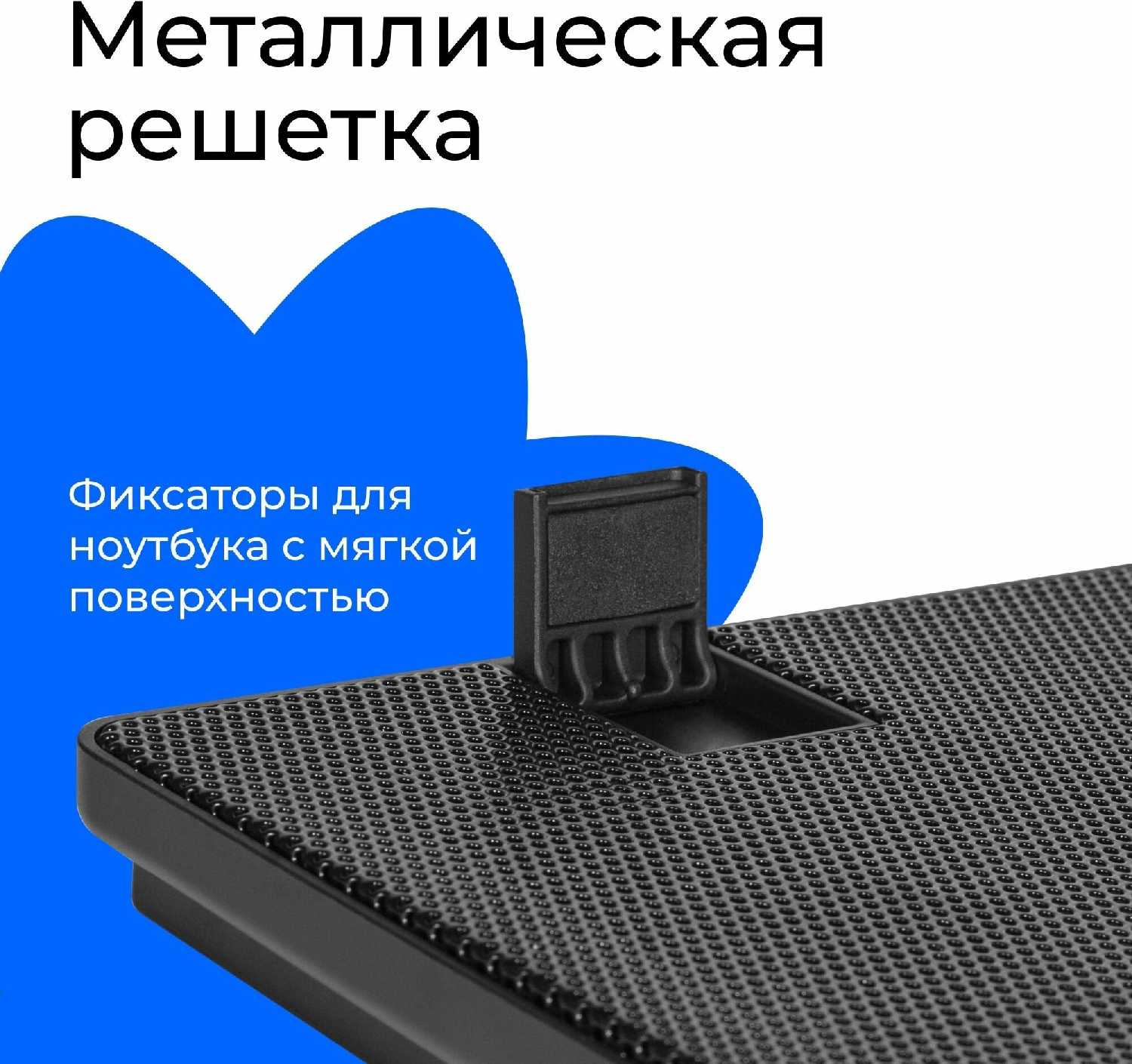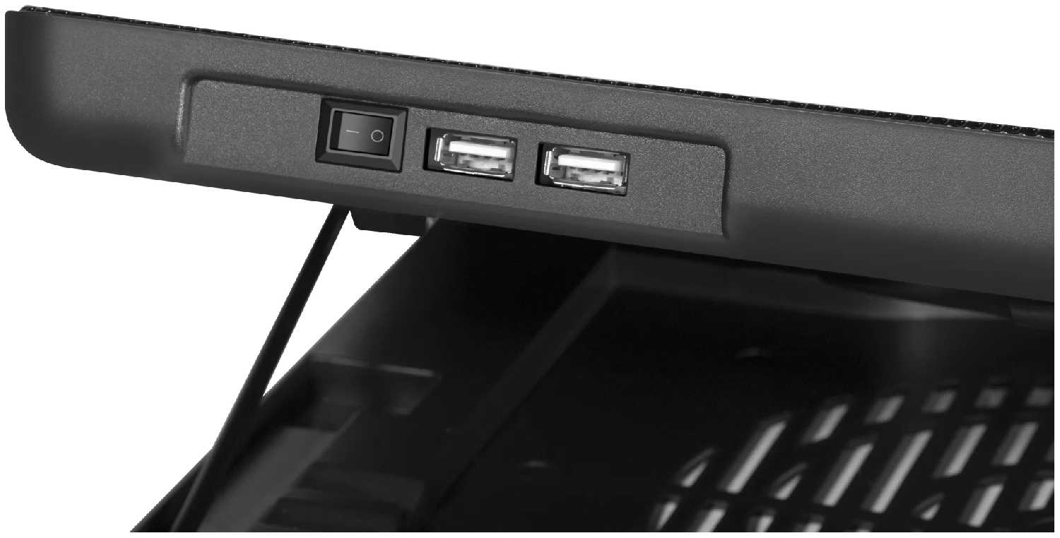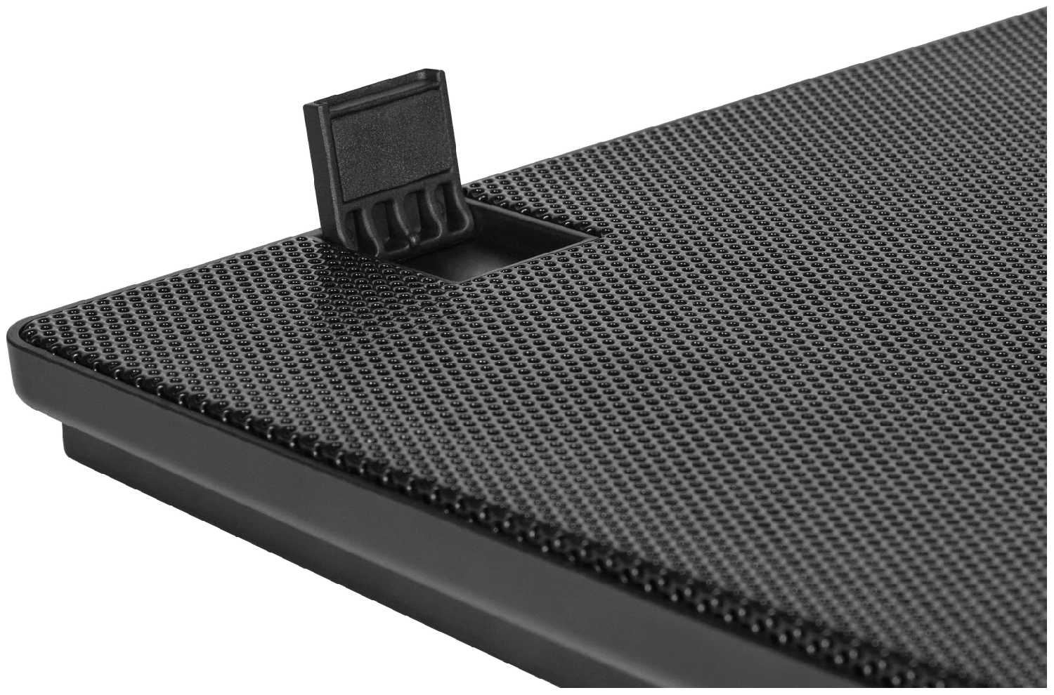 - Прорезиненные ножки и массивное основание эффективно гасят вибрации от работы вентиляторов и предотвращают скольжение подставки по поверхности стола даже при максимальном наклоне.