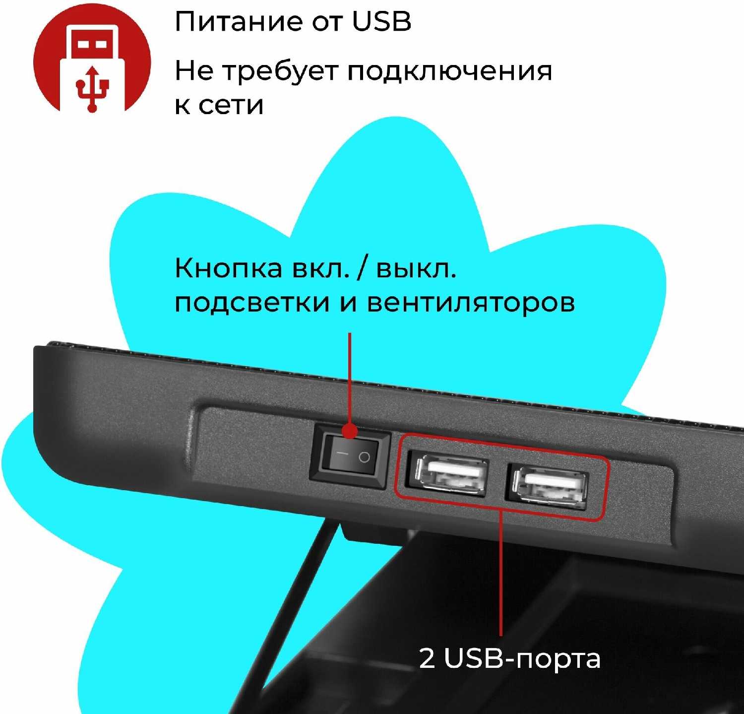 Дополнительные функции включают два USB-порта для подключения периферии, что расширяет возможности ноутбуков с ограниченным числом разъёмов, и съёмную подставку для телефона, которую многие пользователи сочли бесполезной из-за неочевидного крепления и неудобства использования. Питание осуществляется исключительно через USB-кабель от ноутбука или power bank, без возможности подключения к сети через блок питания, что ограничивает максимальную мощность вентиляторов. Подставка выполняет роль не только охлаждающего устройства, но и эргономичной подставки, приподнимающей ноутбук для удобства работы и улучшения естественной вентиляции. Идеально подходит для пользователей с старыми ноутбуками, офисных работников и тех, кто ищет недорогое решение для умеренного снижения температуры и повышения комфорта при работе. Геймерам и владельцам мощных перегревающихся систем рекомендуется рассмотреть более эффективные и дорогие модели.