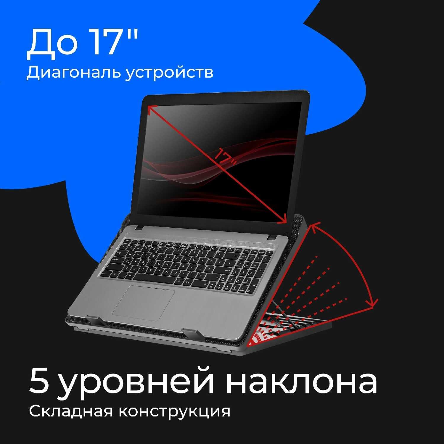 Конструкция предусматривает несколько фиксированных положений наклона, обычно до шести вариантов, что позволяет выбрать удобный угол для работы или игр. Механизм регулировки надежен, а прорезиненные ножки обеспечивают устойчивость на столе. Однако при максимальном подъеме ноутбуки с гладким дном могут немного смещаться, поэтому рекомендуется проверять устойчивость. -