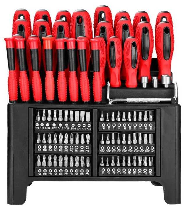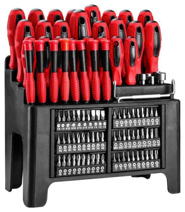 - Все в одном месте, включая угловые отвертки и воротки, что удобно для хранения.