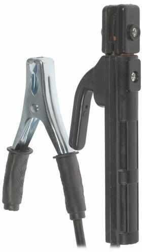 Держатель электрода в комплекте имеет компактные размеры и достаточно тугой ход, что оценивается положительно. Однако зажим массы ("прищепка") слабоват — недостаточная сила прижима может ухудшать контакт, что влияет на стабильность дуги. Многие пользователи рекомендуют сразу заменить зажим массы на более качественный, особенно при работе с окисленными или загрязненными поверхностями.