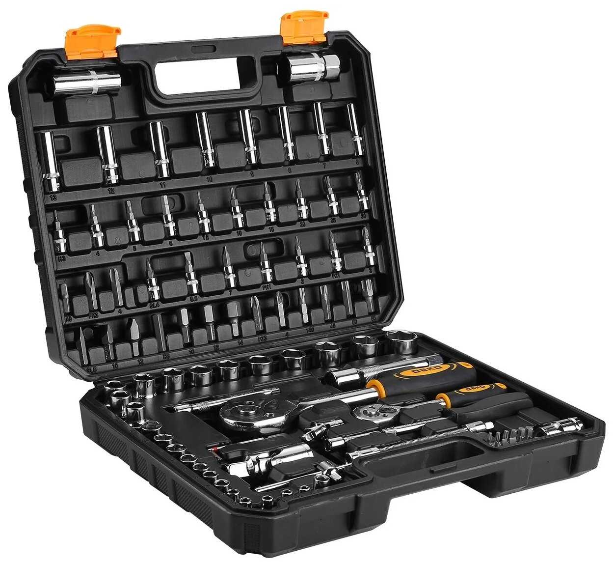 - В комплект входят 94 предмета, включая свечной ключ, гибкий удлинитель и головки разных размеров (например, 1/2").